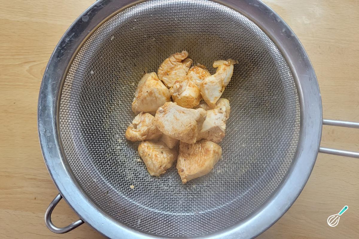 Quando o frango estiver macio, escorra sobre uma peneira para guardar o caldo que será usado no creme.