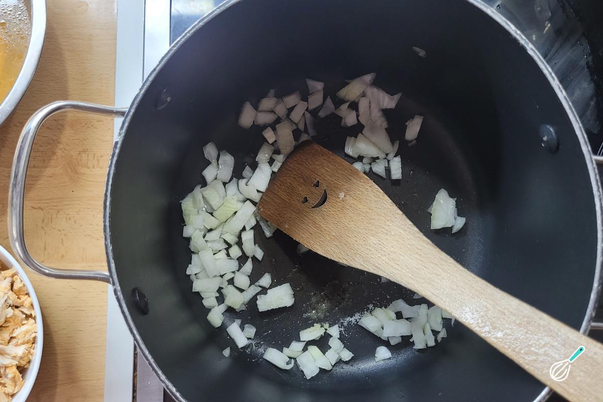 Agora vamos começar o preparo do creme propriamente dito. Em uma panela, coloque um fio de azeite e leve a cebola para refogar. Tempere com um pouco de sal.