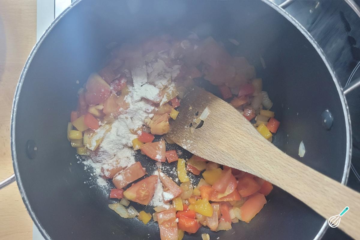 Adicione a farinha e deixe cozinhar um pouco - é ela que vai ajudar a engrossar o creme.