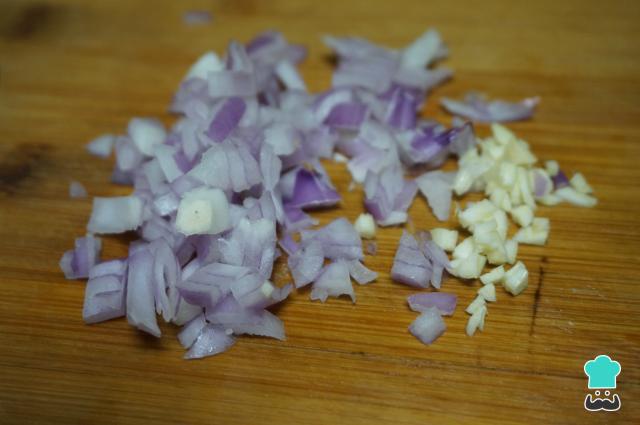 Comece por descascar a cebola e o alho e picar em cubinhos, como na foto.