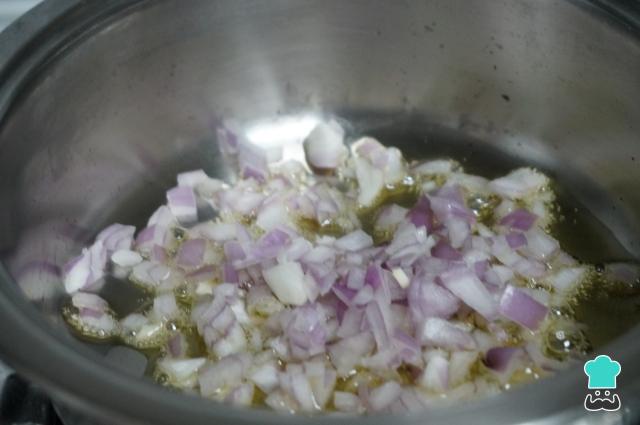 Leve ao fogo médio-baixo uma panela com um fio de azeite e coloque a cebola. Deixe fritar até ficar douradinha e, depois, adicione o alho e misture - é importante colocar o alho depois da cebola para evitar que ele queime e fique amargo.
