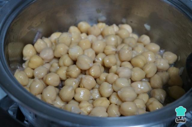 Quando o alho começar a dourar, coloque na panela o grão de bico cozido e escorrido. Misture e deixe por mais 1 minuto no fogo médio-baixo.