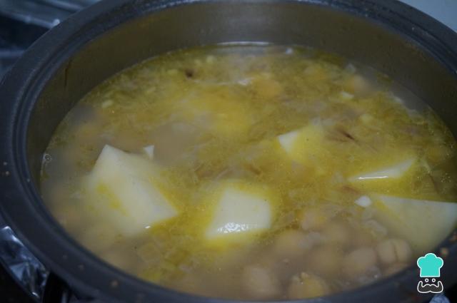 Dica: Recomendamos usar grão de bico já cozido para agilizar o preparo desta sopa. Para isso, deixe-o antecipadamente de molho em água durante uma noite, escorra e cozinhe numa panela de pressão com água abundante por 30-40 minutos.