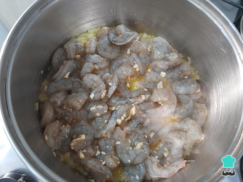 Numa panela, aqueça o azeite de oliva e refogue a cebola ralada. Adicione a manteiga e os camarões e deixe refogando até que fiquem levemente rosados (cerca de 5 a 7 minutos, virando os lados dos camarões).