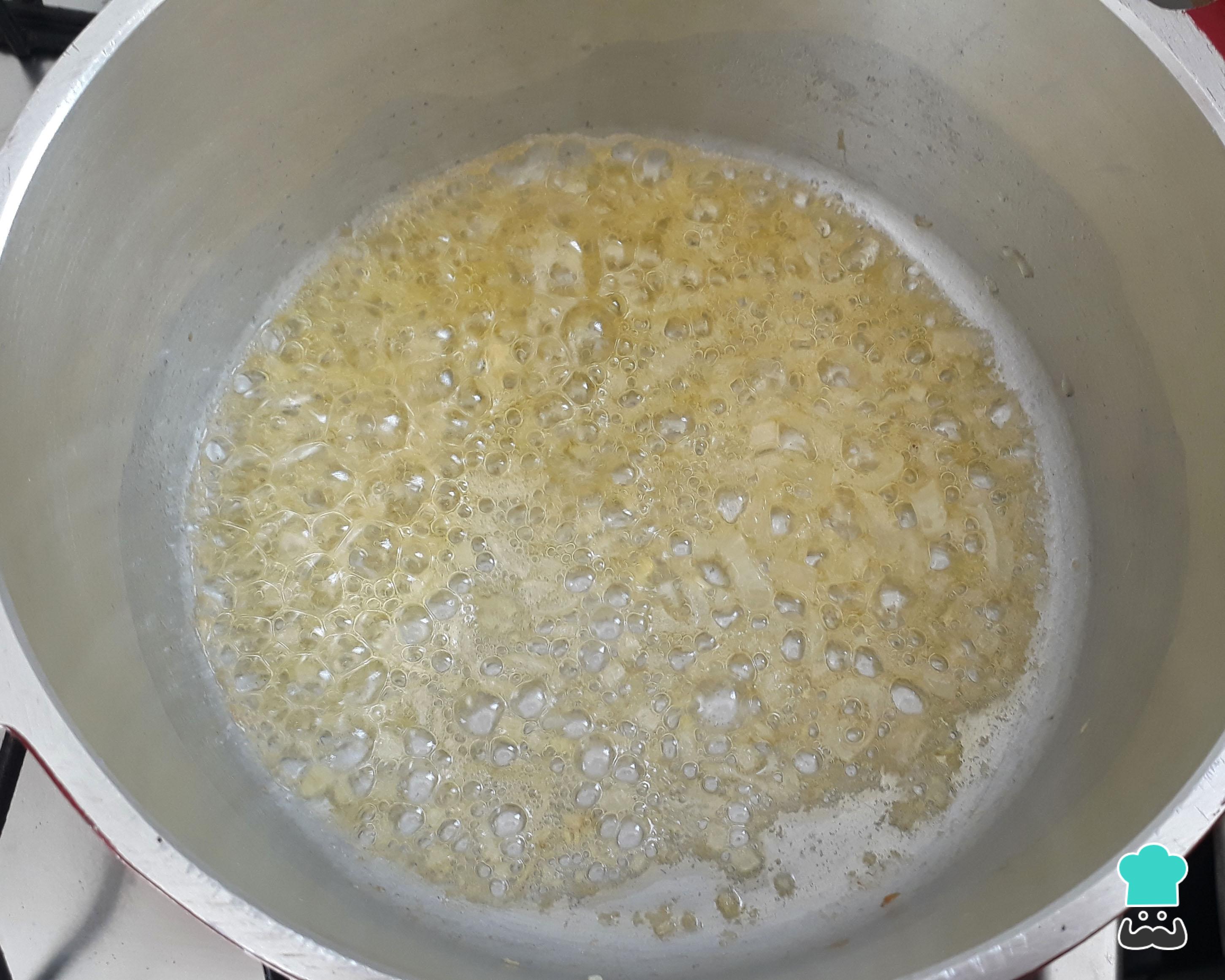 Em uma panela junte a manteiga, o azeite e a cebola. Deixe refogar até murchar.