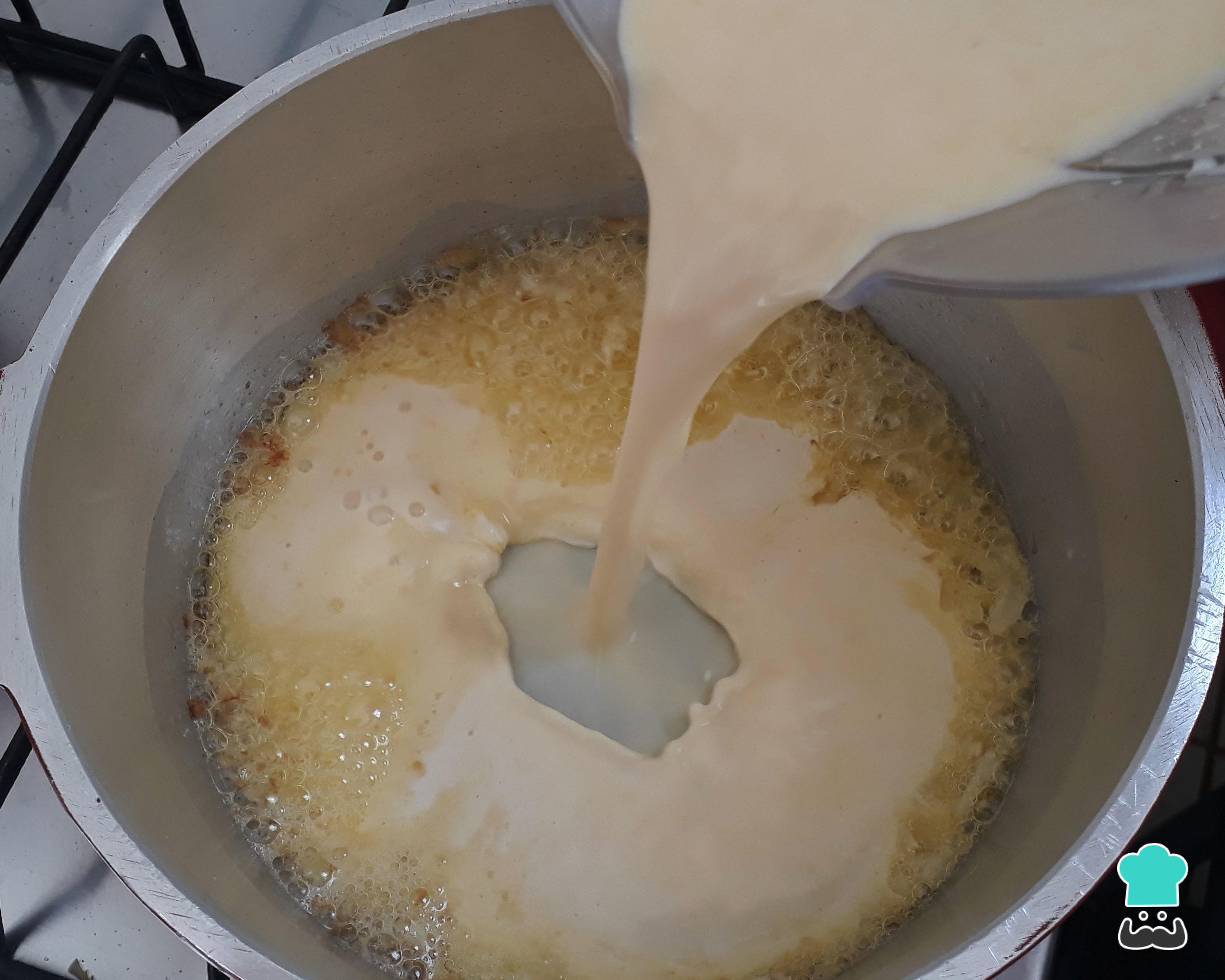 Despeje a mistura do liquidificador nesse refogado. Deixe no fogo baixo e mexa sem parar até virar um creme liso e espesso.