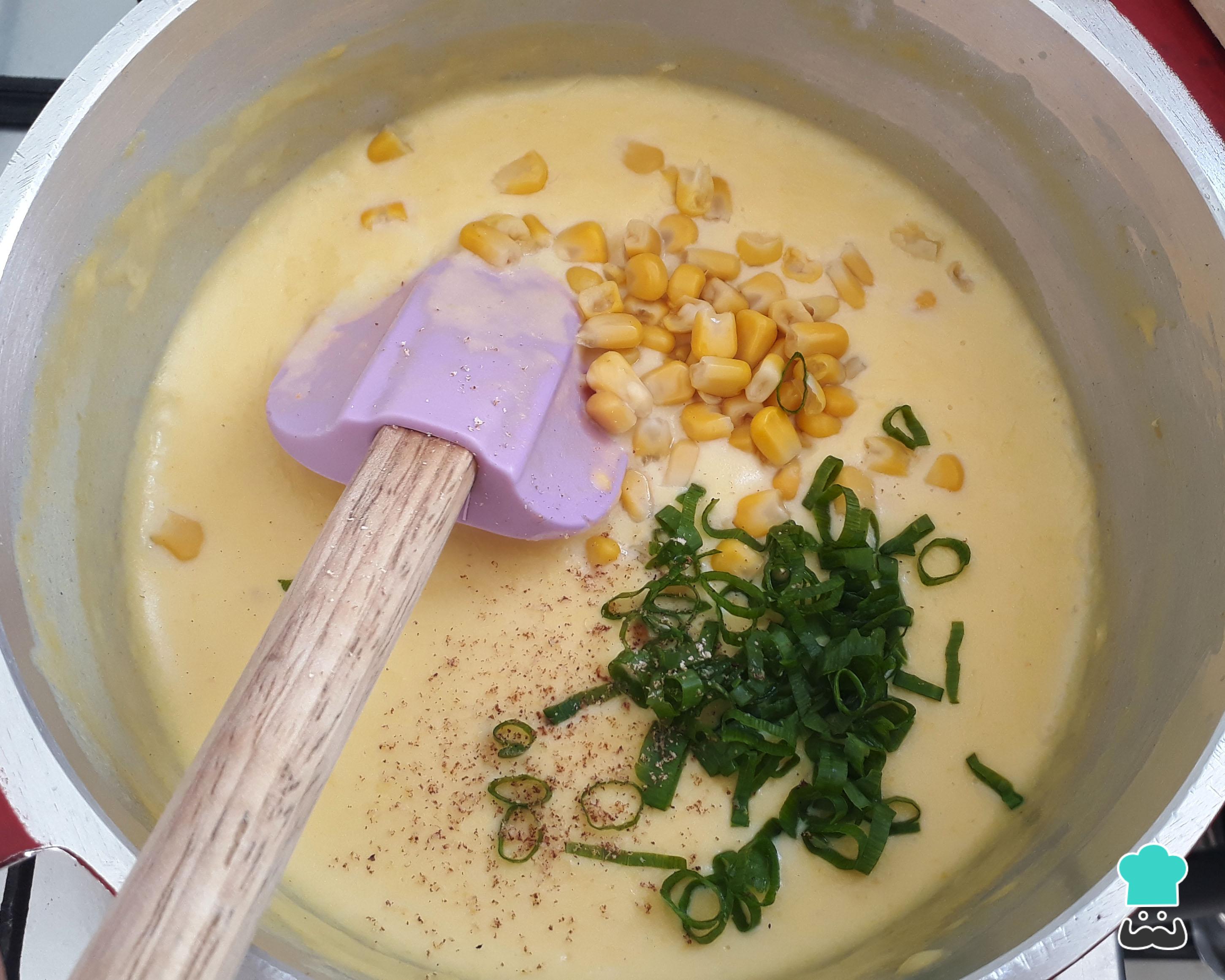 Por fim, finalize com os grãos de milho reservados no início do preparo e os temperos: a noz moscada ralada na hora e a cebolinha. Mexa bem e sirva ainda quente.