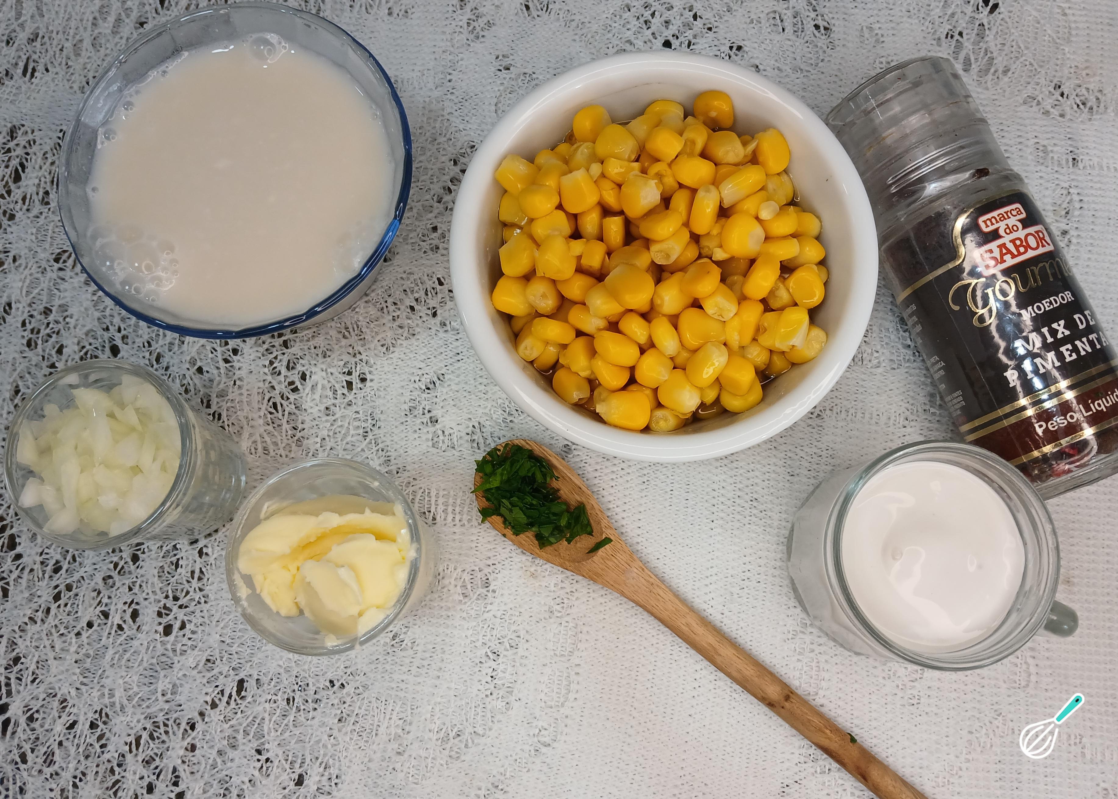 Comece separando os ingredientes para o preparo do creme de milho sem leite. Drene a lata de milho e reserve.