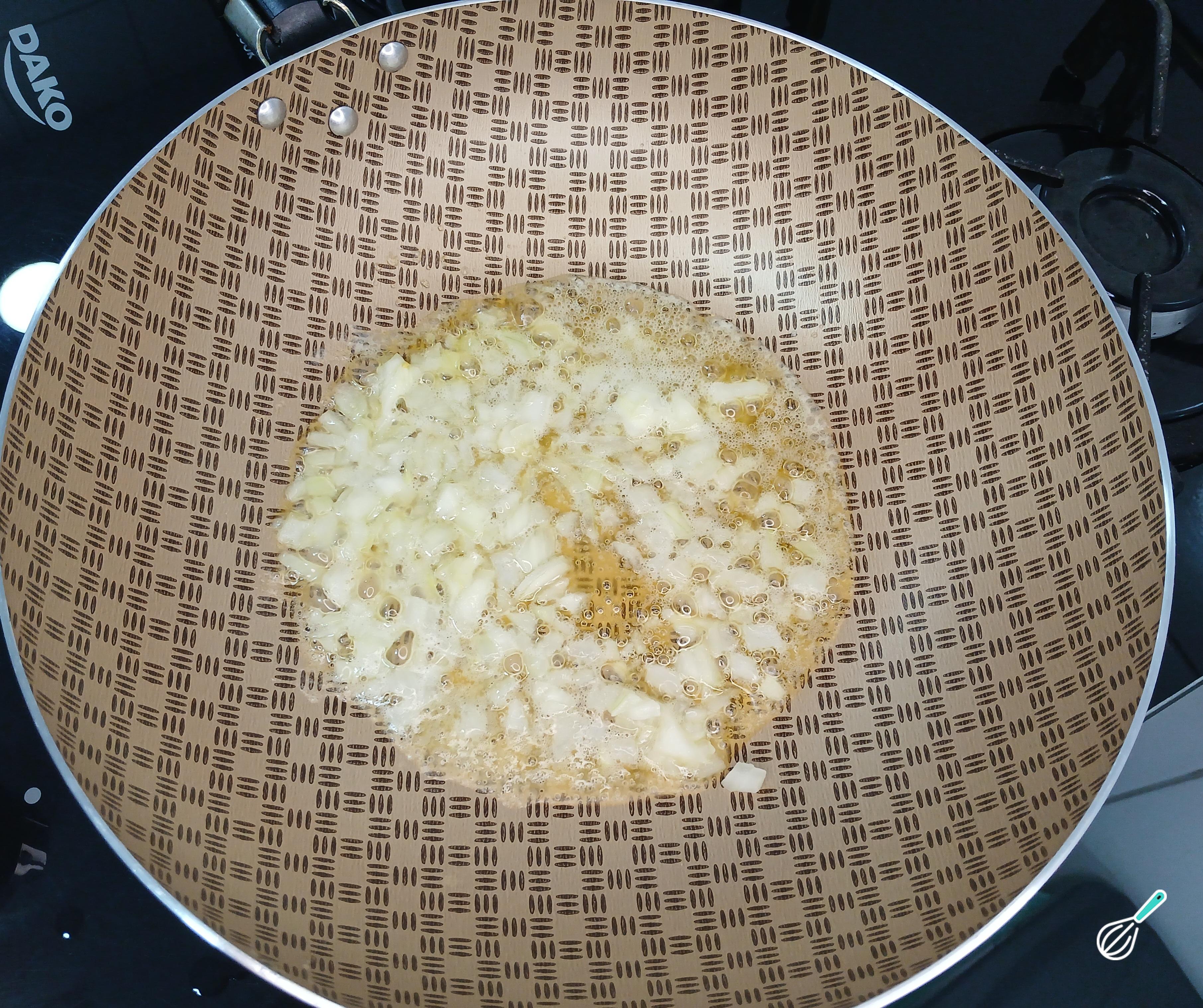 Em uma panela, coloque a margarina e coloque a cebola branca para refogar.