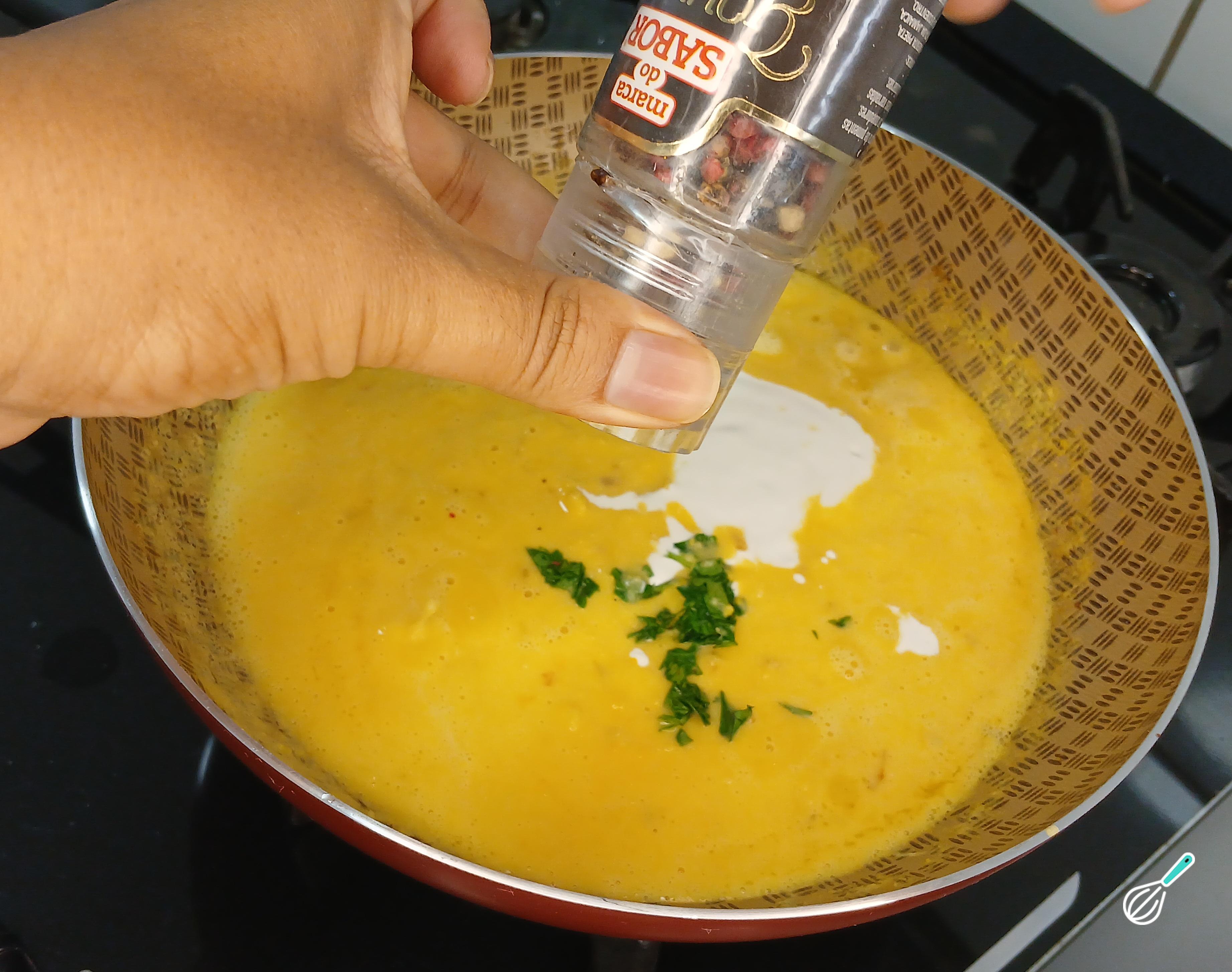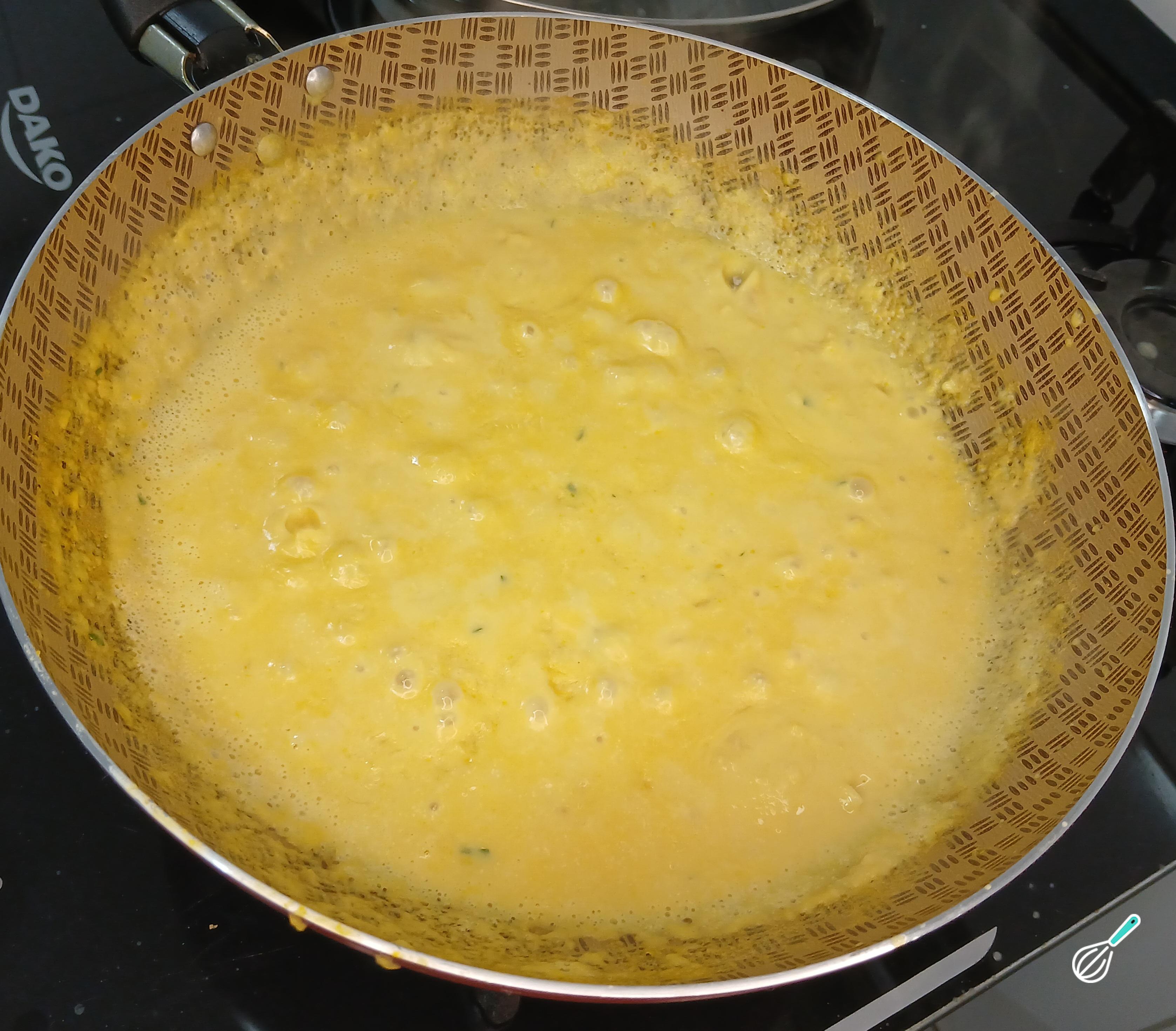 Com os ingredientes já adicionados, o creme precisa reduzir ainda mais para chegar a uma textura cremosa e perder a textura liquida.
