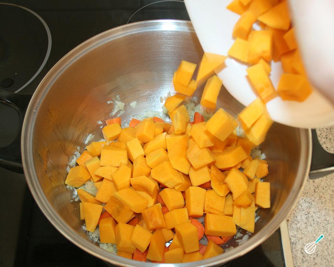 Em seguida adicione todos os demais legumes na panela: o milho, a abóbora, a cenoura e a batata. Misture e deixe os legumes "suar" por 1-2 minutos.