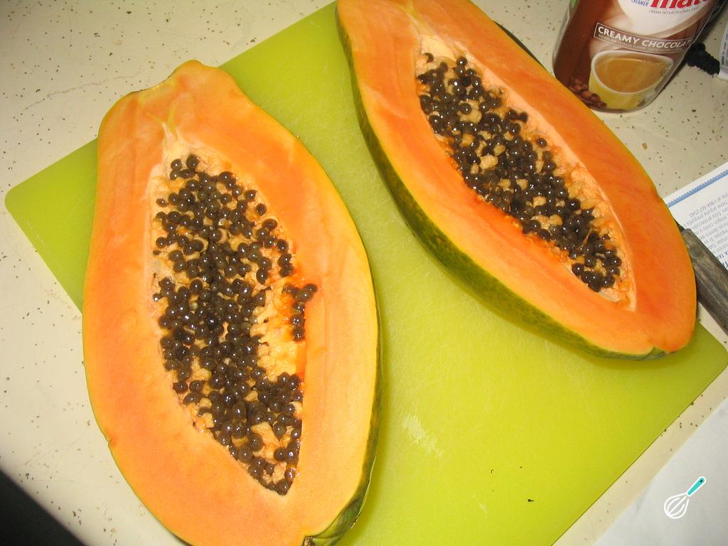 Para fazer esta receita de creme de papaia comece por descascar o mamão papaia e retirar as sementes.