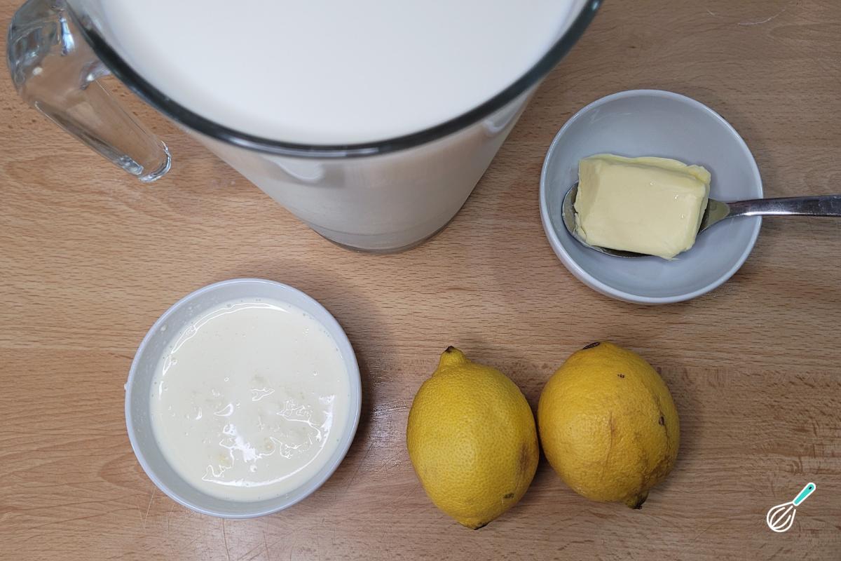 Separe os ingredientes para fazer seu creme de ricota caseiro. Aqui fazemos todo o processo do zero, incluindo fazer a ricota. Essa receita rende bastante e você pode usar o soro remanescente para outras receitas.