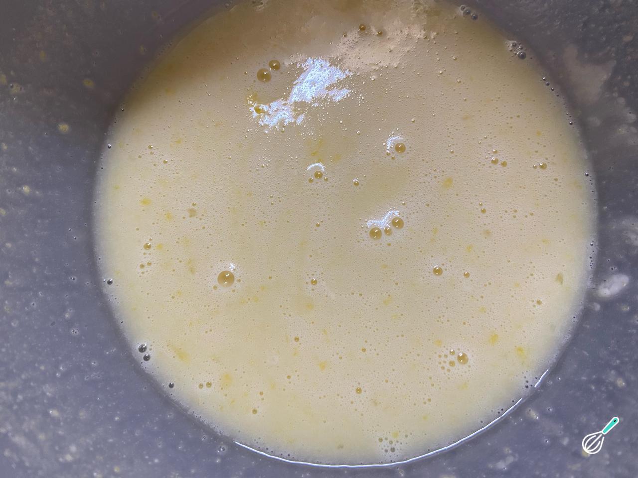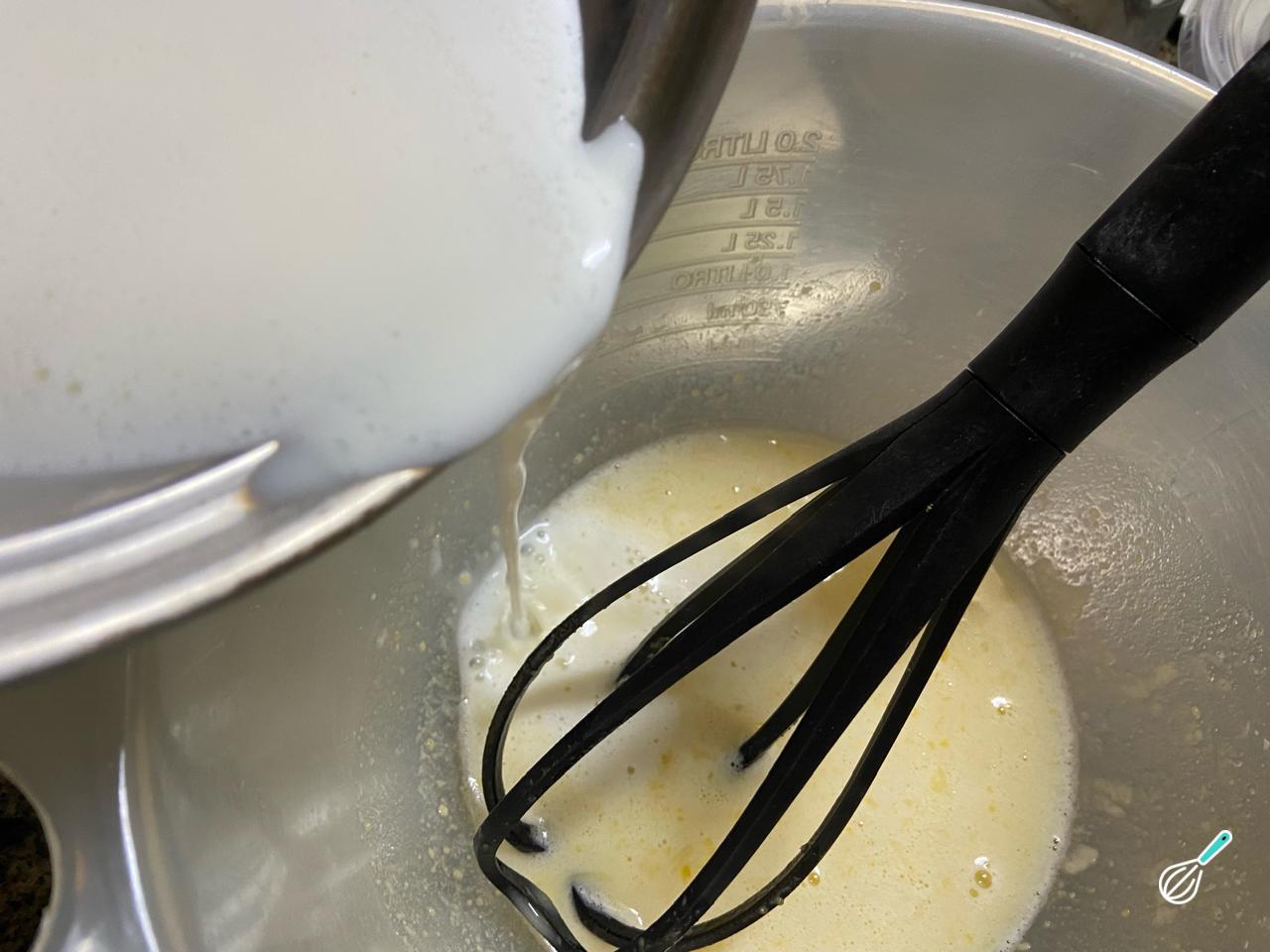 Coloque o restante do leite em uma panela em fogo alto. Quando ferver, despeje-o sobre a mistura de gemas de ovos, açúcar e amido de milho, batendo rapidamente.
