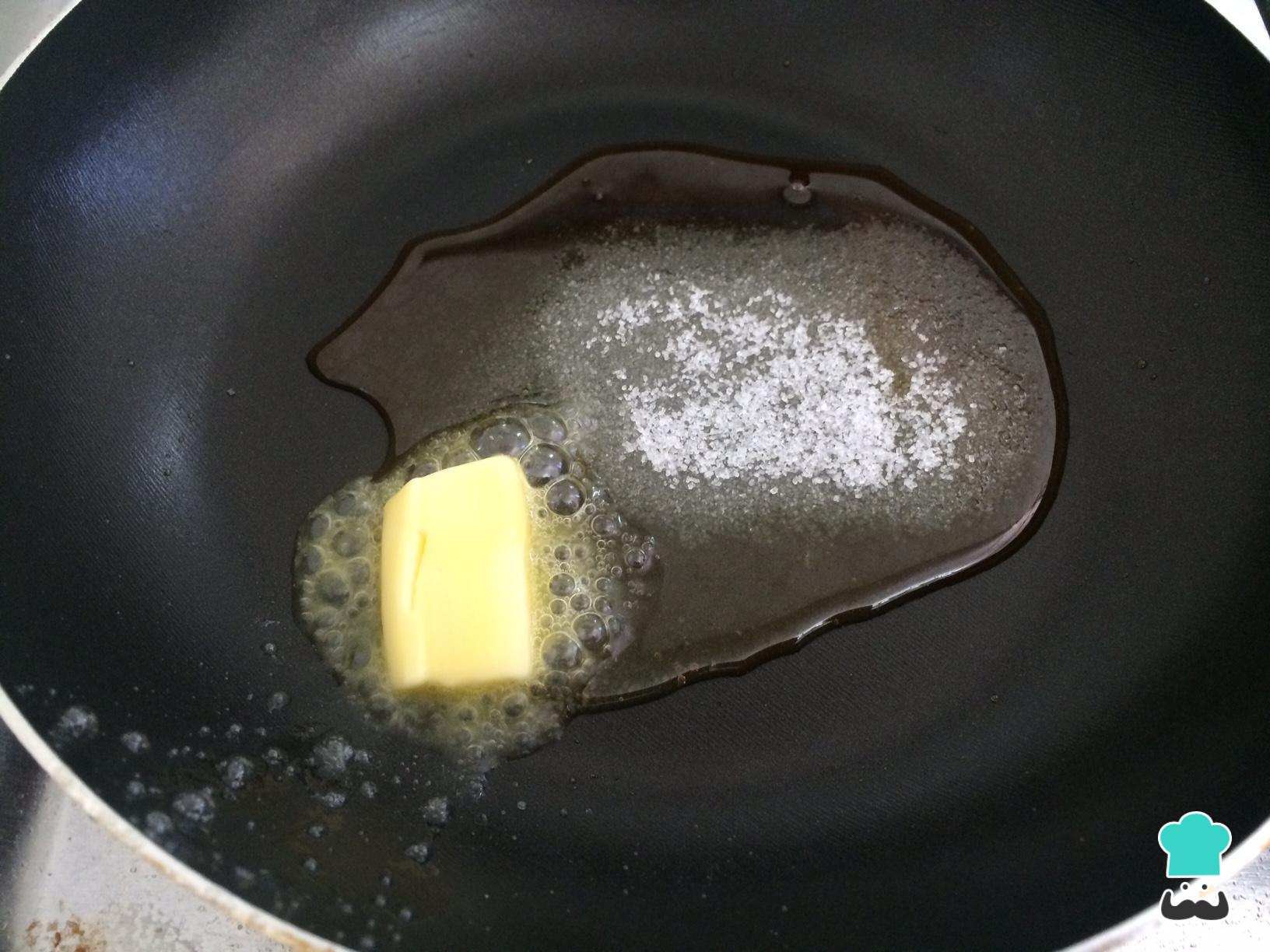 Para fazer a banana caramelizada, o primeiro passo é colocar o açúcar derretendo em uma frigideira em fogo baixo. Depois adicione a manteiga e misture muito bem.
