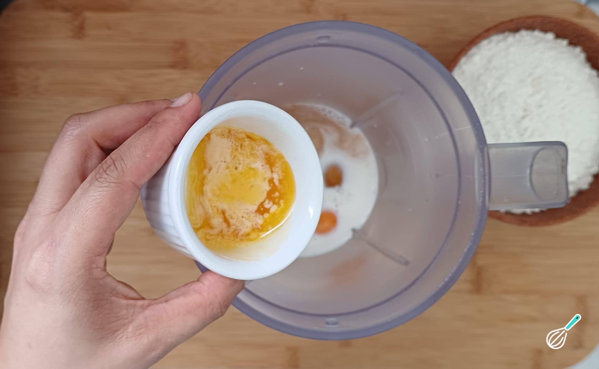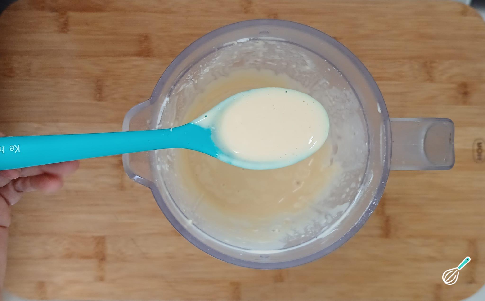 Prepare a massa, batendo no liquidificador o leite, os ovos, a essência de baunilha, o açúcar e a manteiga até que forme um líquido homogêneo.
