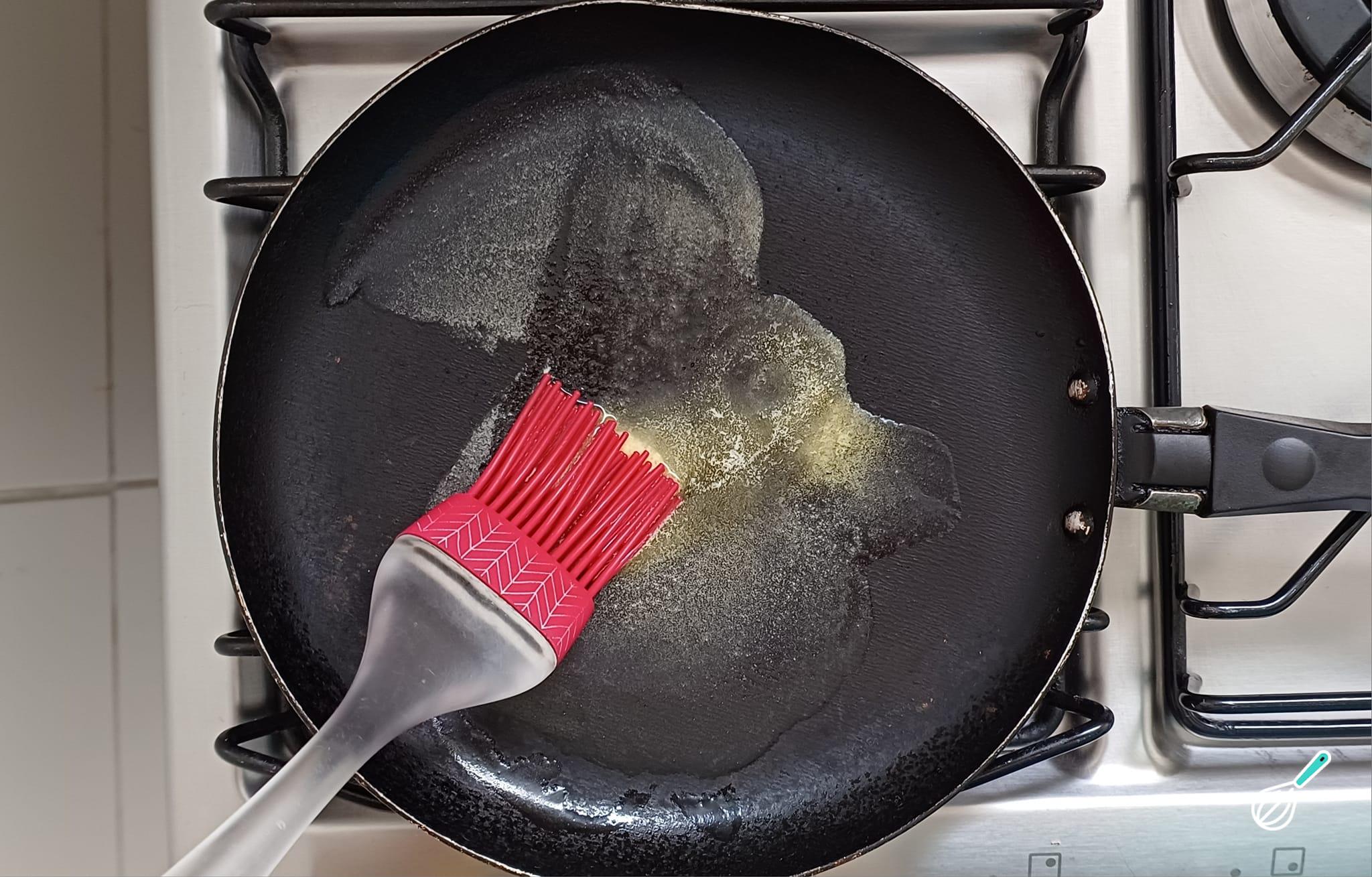 Unte uma frigideira antiaderente com um pouco de manteiga, espalhando bem com um pincel.