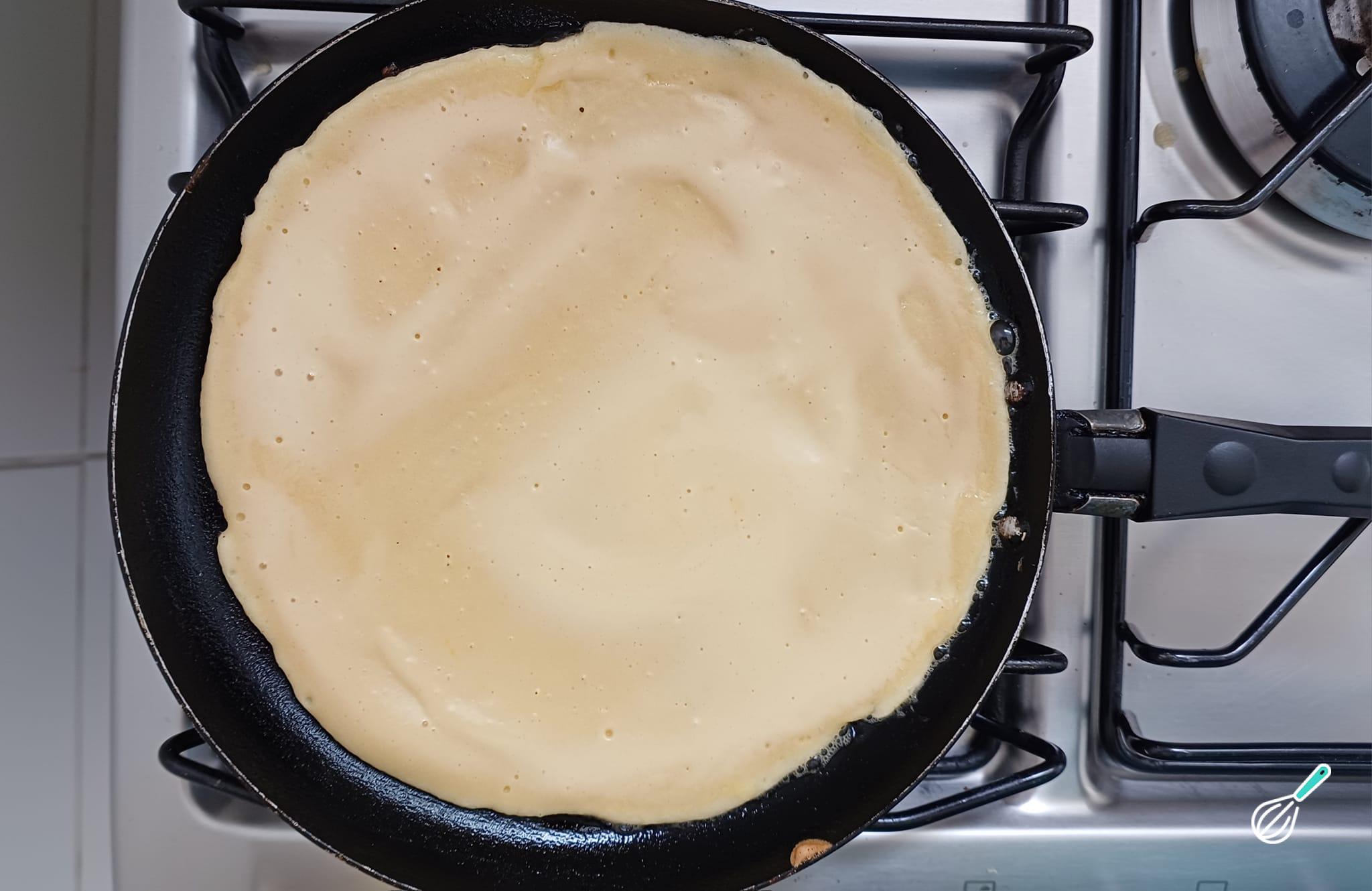 Ligue o fogo baixo e quando a frigideira estiver aquecida, coloque um pouco da massa do crepe, espalhando com uma colher ou espátula, deixando a massa mais fina.
