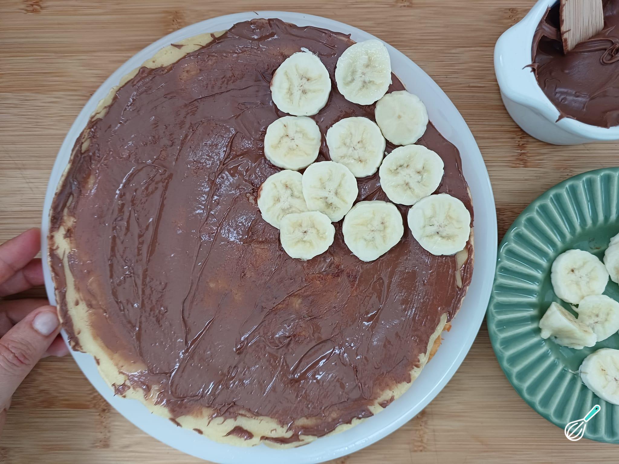 Espalhe a nutella por toda a massa e em seguida, preencha 1/4 dela com rodelas de banana.