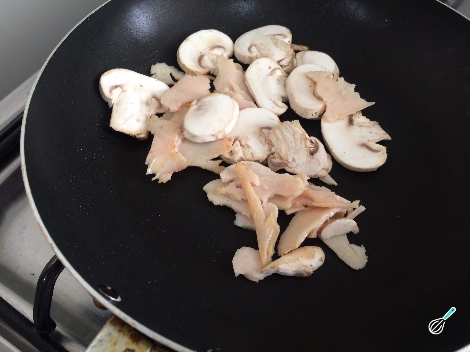 Separadamente, comece preparando o recheio dos crepes. Numa frigideira com um pouco de óleo, salteie os cogumelos cortados em fatias, adicione o presunto de peru picado e refogue até que tudo esteja dourado.
