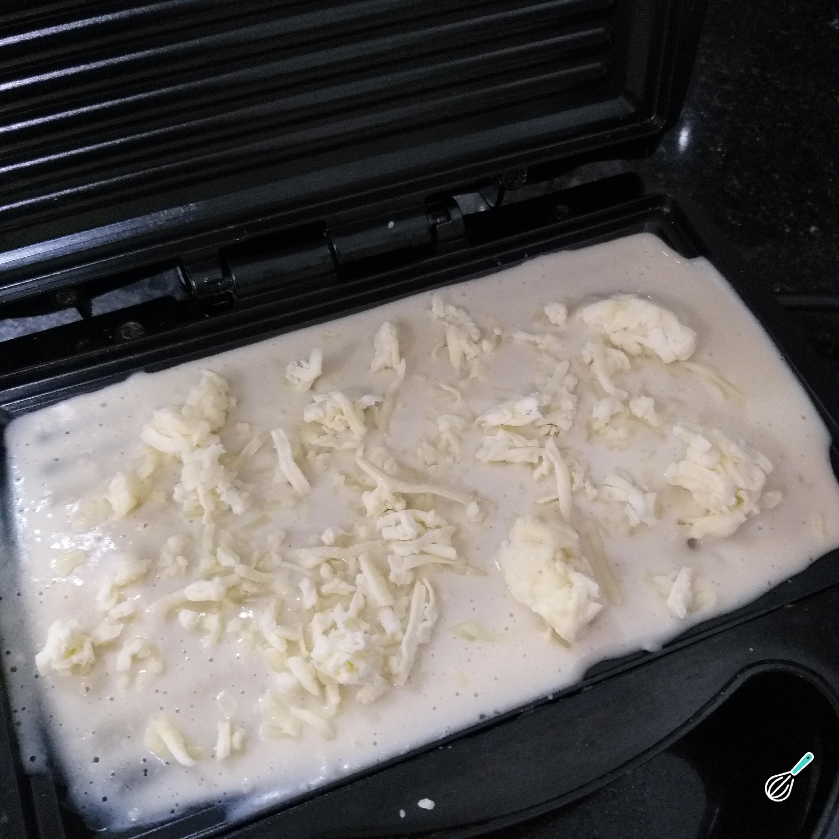Aqueça a sanduicheira por 2 minutos e unte-a com um fio de óleo. Despeje a massa e o recheio (eu usei muçarela ralada, mas existem muitas opções que você pode testar).