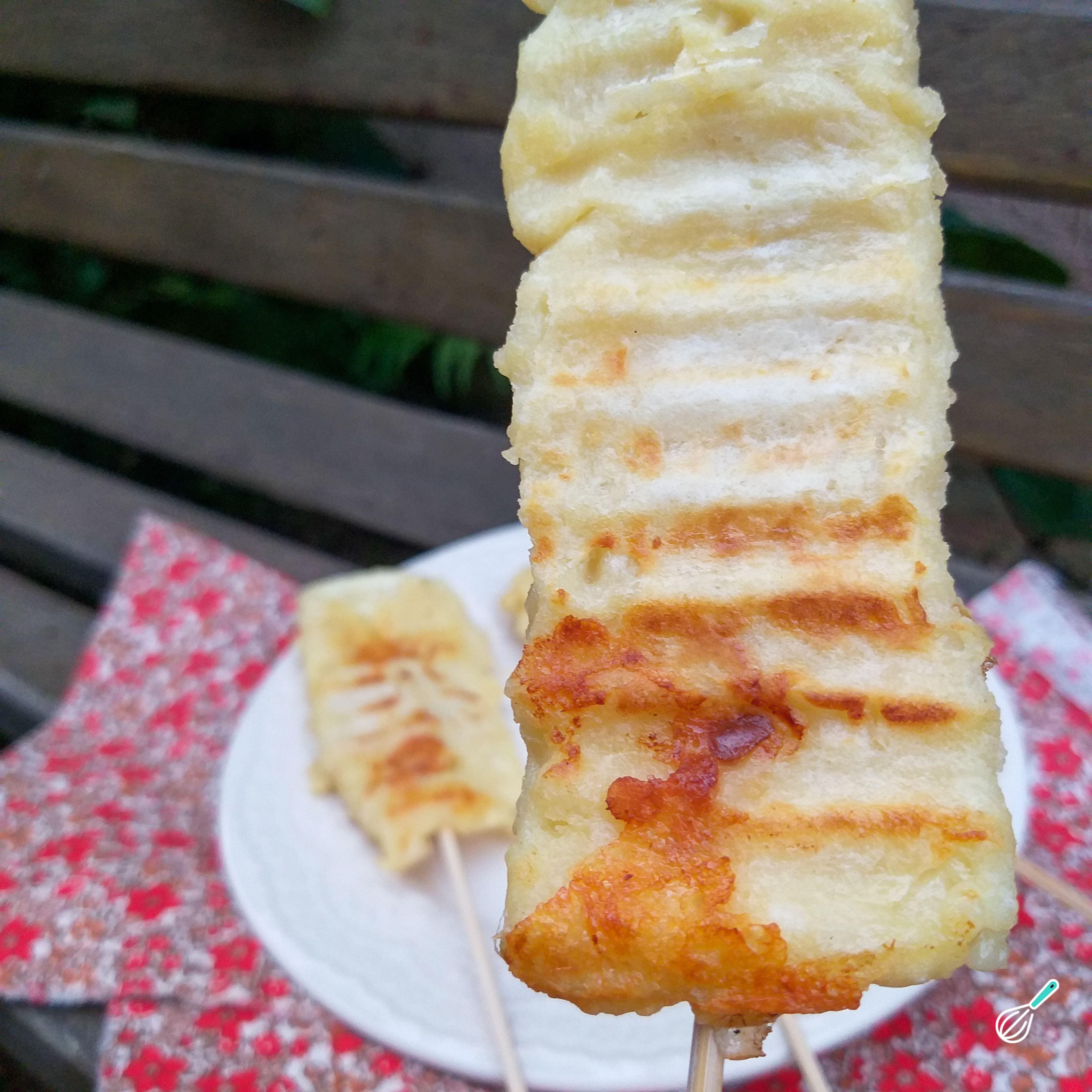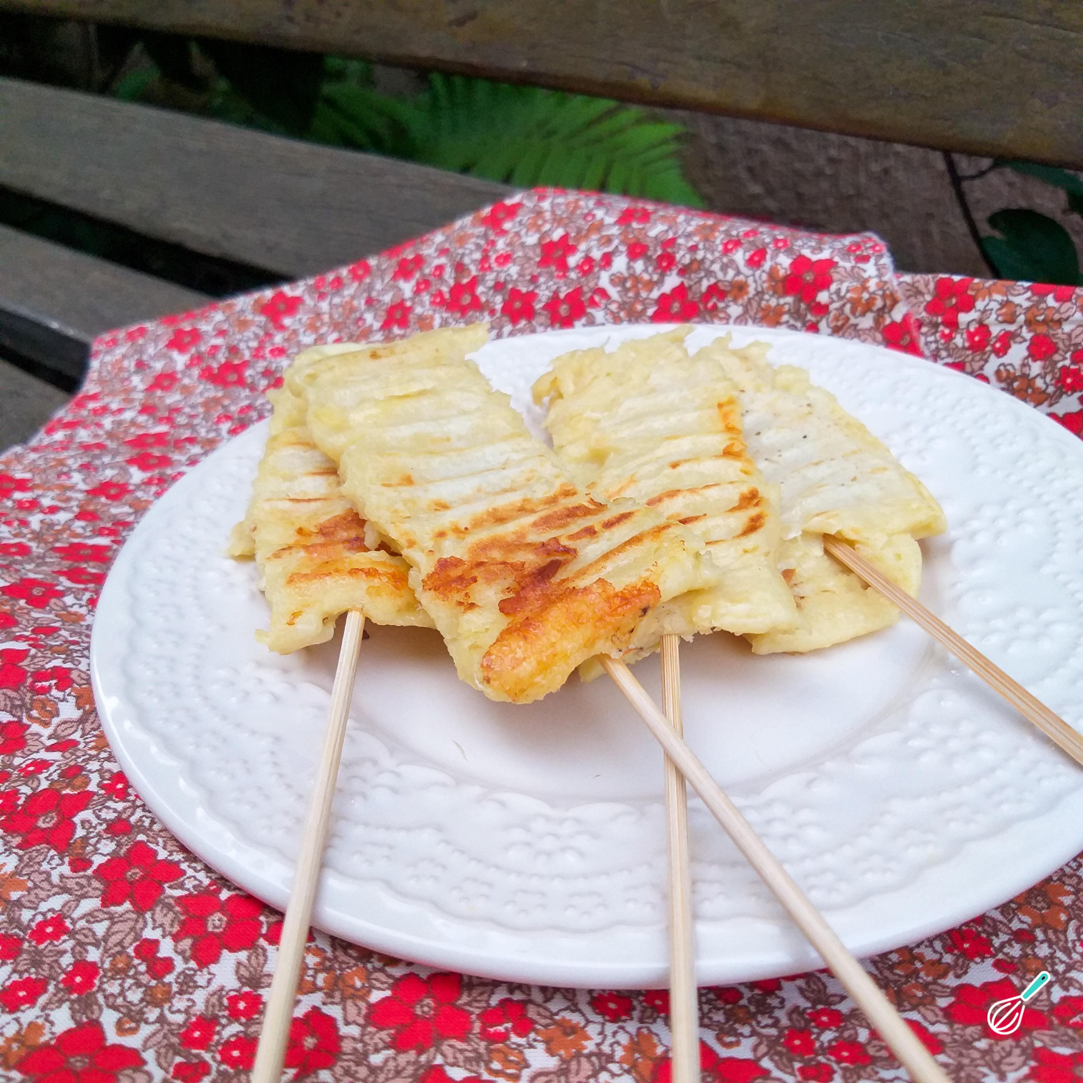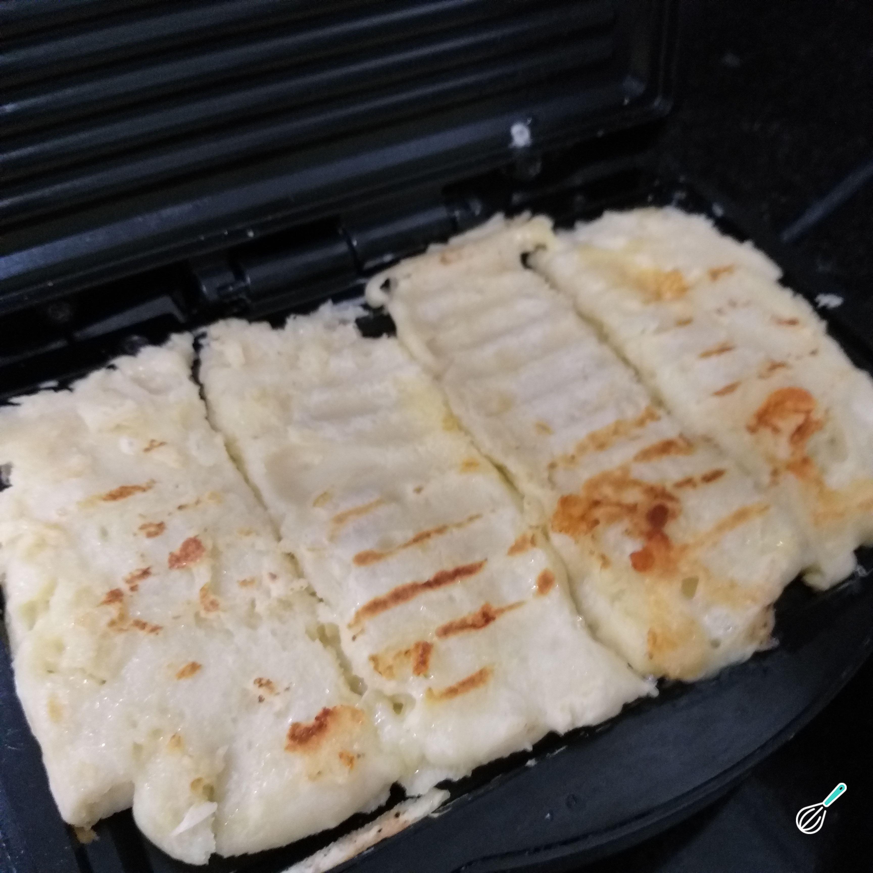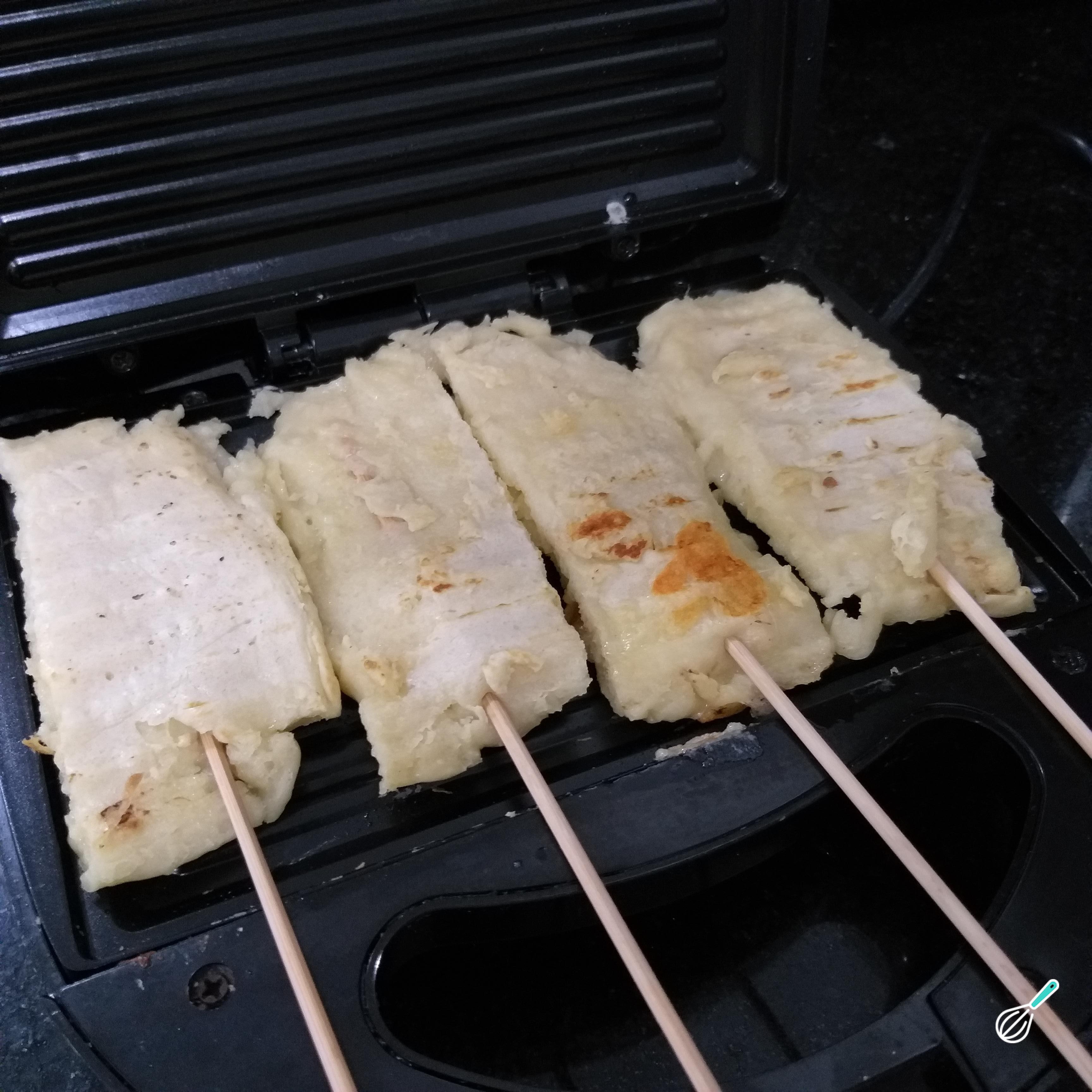 Coloque palitos em cada um dos pedaços e deixe a massa por mais alguns minutos na sanduicheira, até dourar em ambos os lados.