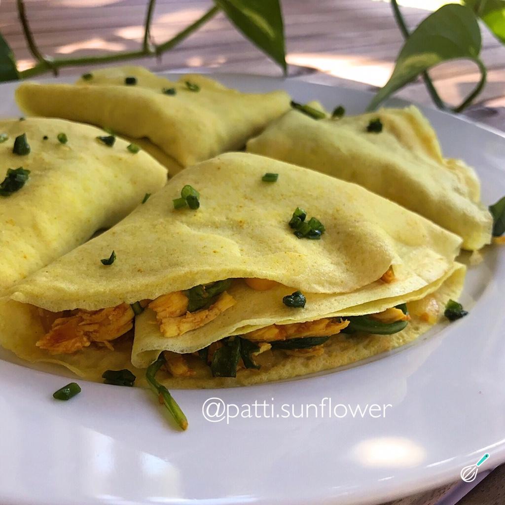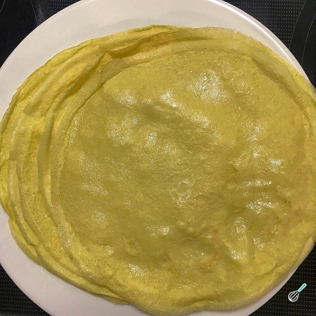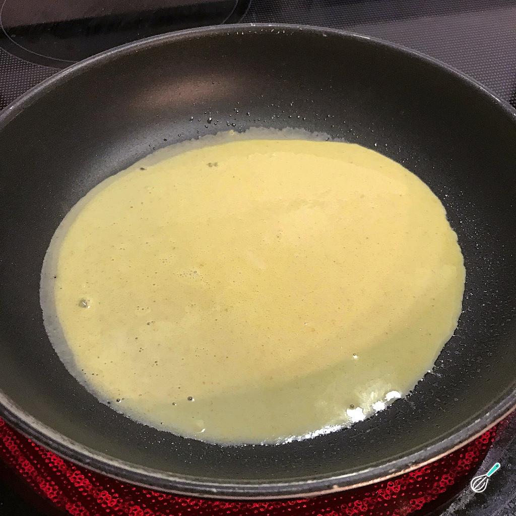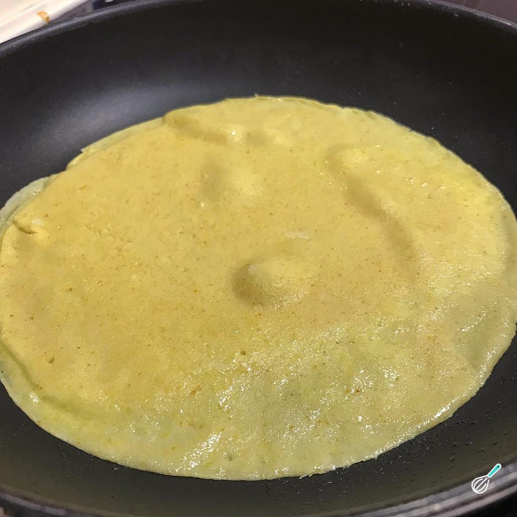 Aqueça uma frigideira com um pouco de azeite e jogue uma 1/2 concha da massa. Espalhe bem, virando a frigideira (a quantidade depende do tamanho da sua frigideira, usei uma pequena de 20 cm).
