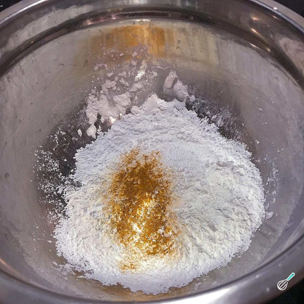 Comece misturando a farinha de arroz integral com o amido de milho, a cúrcuma, o polvilho doce, o sal e a pimenta.