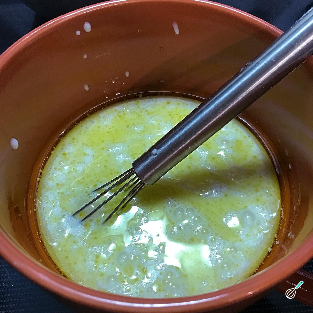 Num pote misture o ovo com 1 colher de sopa de azeite, a água e o creme de coco.