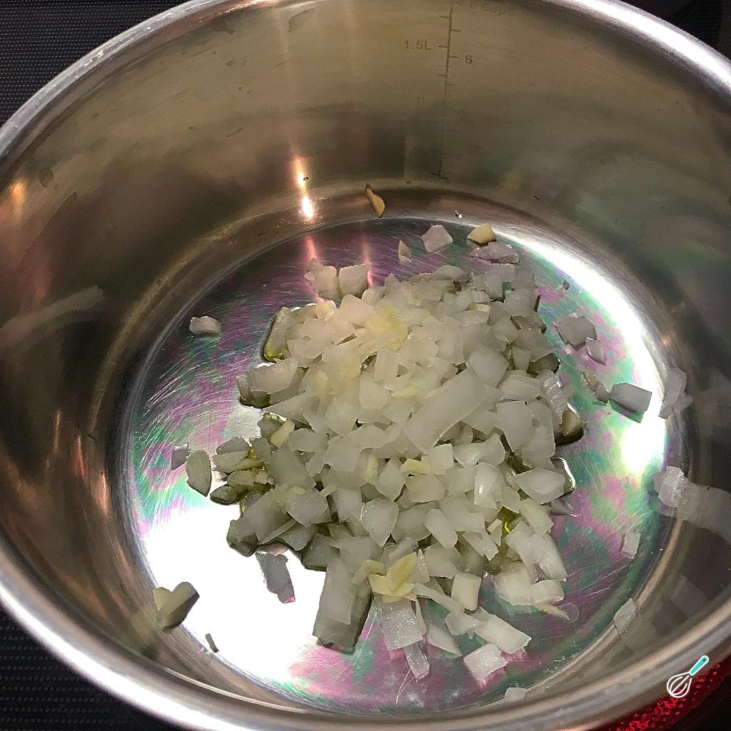 Para o recheio de crepe suíço refogue a cebola e o alho junto com 1/2 colher de sopa de azeite, até a cebola ficar translúcida.