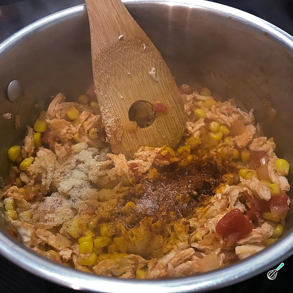 Acrescente então o frango desfiado, o milho e temperinhos (sal, pimenta e, se quiser, alguma erva seca).