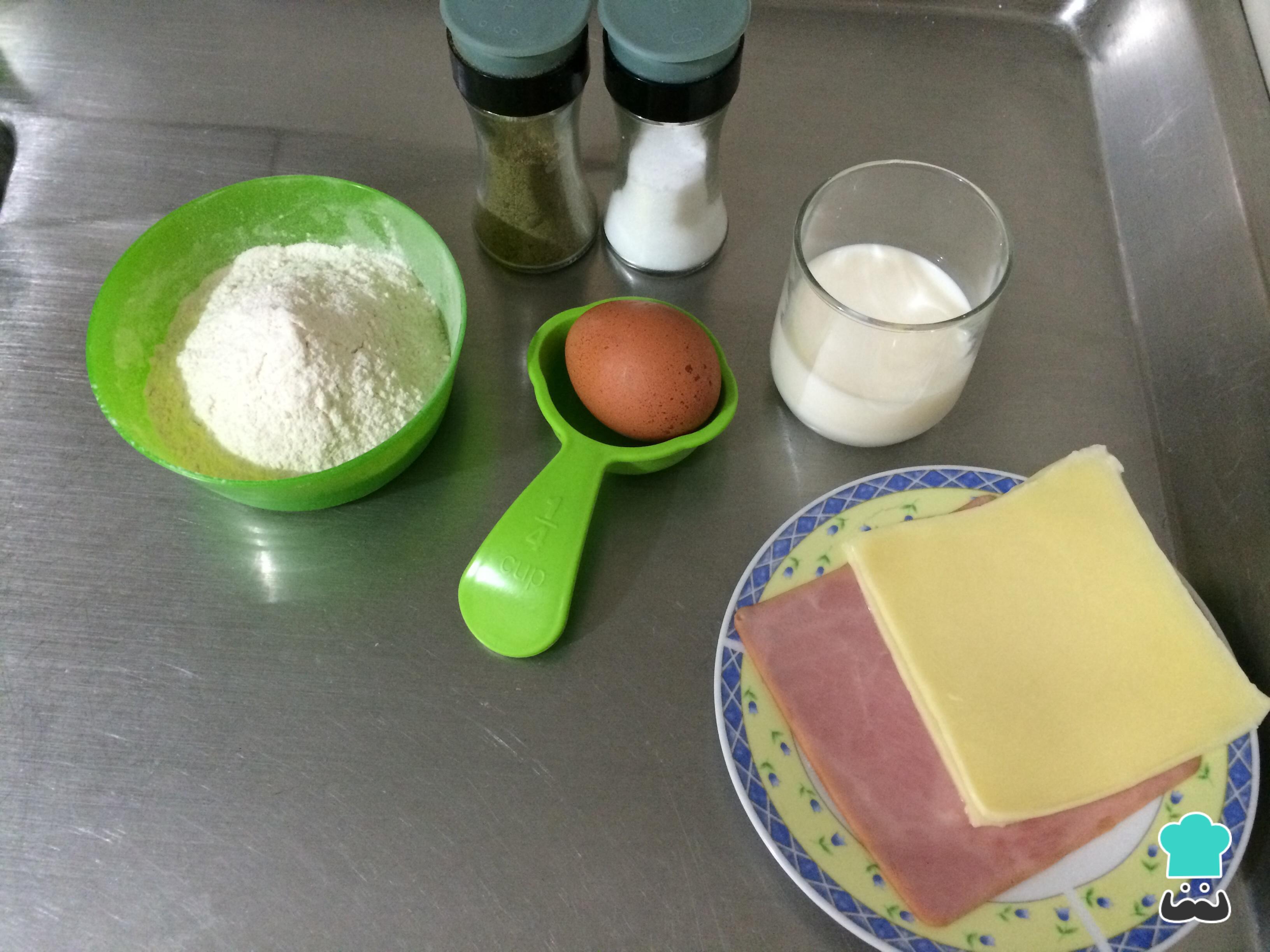 Para preparar estes saborosos crepes salgados de presunto e queijo comece por reunir os ingredientes.