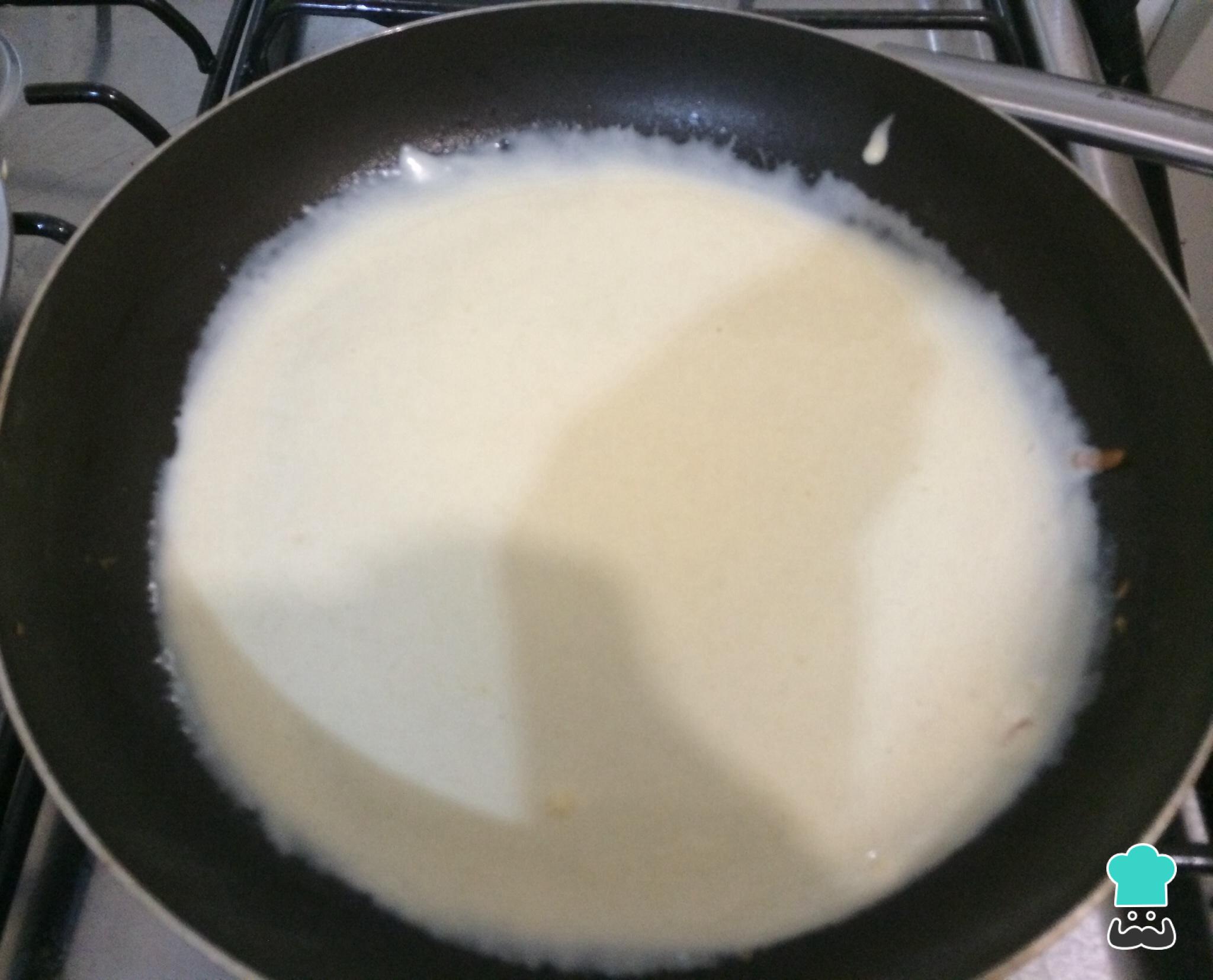 Em uma frigideira antiaderente quente, derreta a manteiga. Adicione um pouco da massa dos crepes salgados de presunto e queijo e cozinhe em fogo baixo por 4 minutos, aproximadamente.
