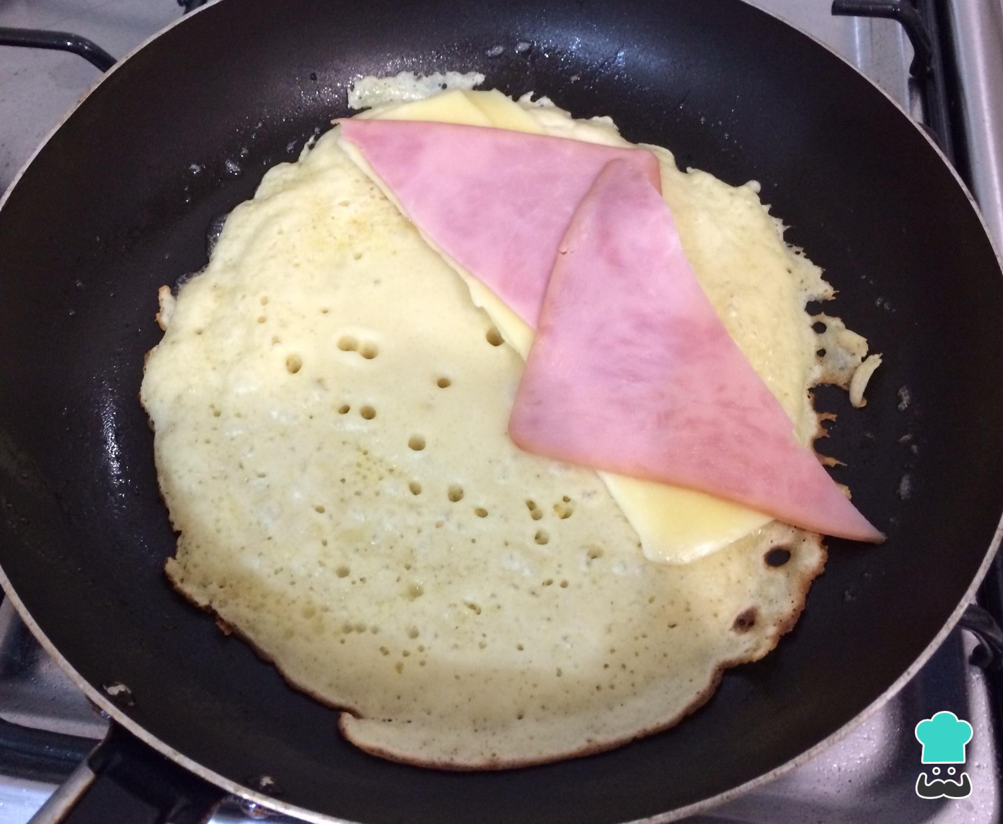 Após esse tempo coloque sobre metade do crepe duas fatias de queijo e presunto temperados com uma pitada de pimenta. Feche e cozinhe por mais 2 minutos.