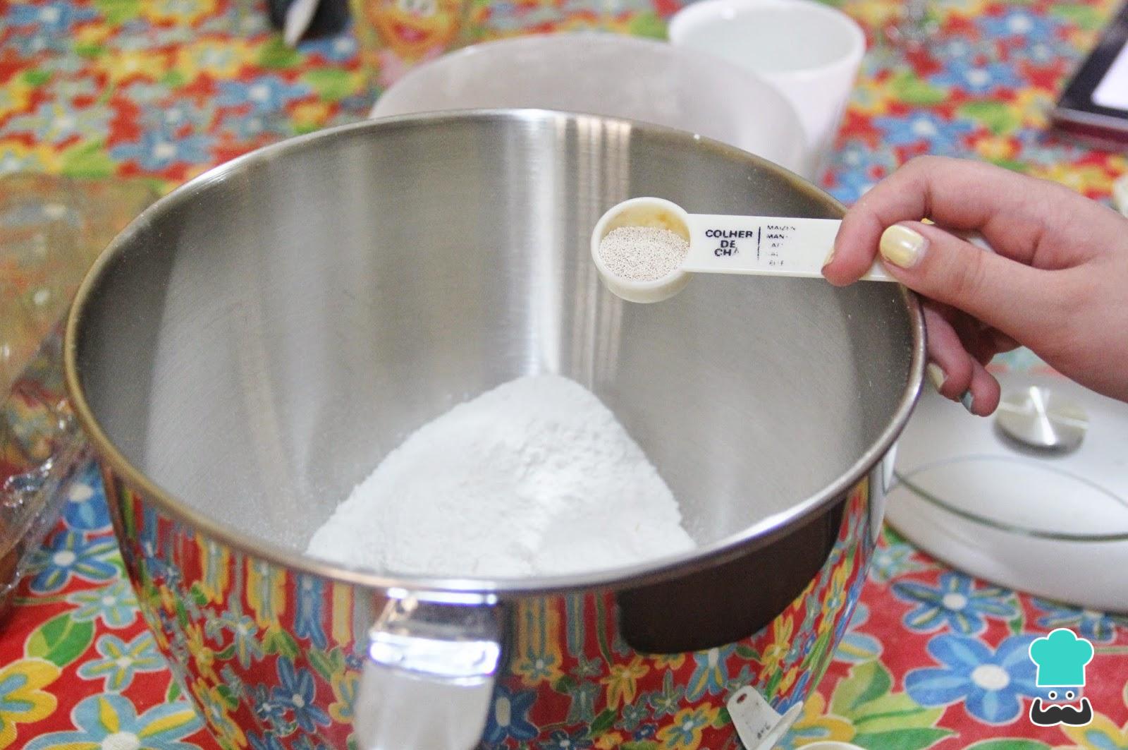 Para fazer estes crepes de polvilho comece por misturar os ingredientes secos em uma tigela: o polvilho, o sal e o açúcar.