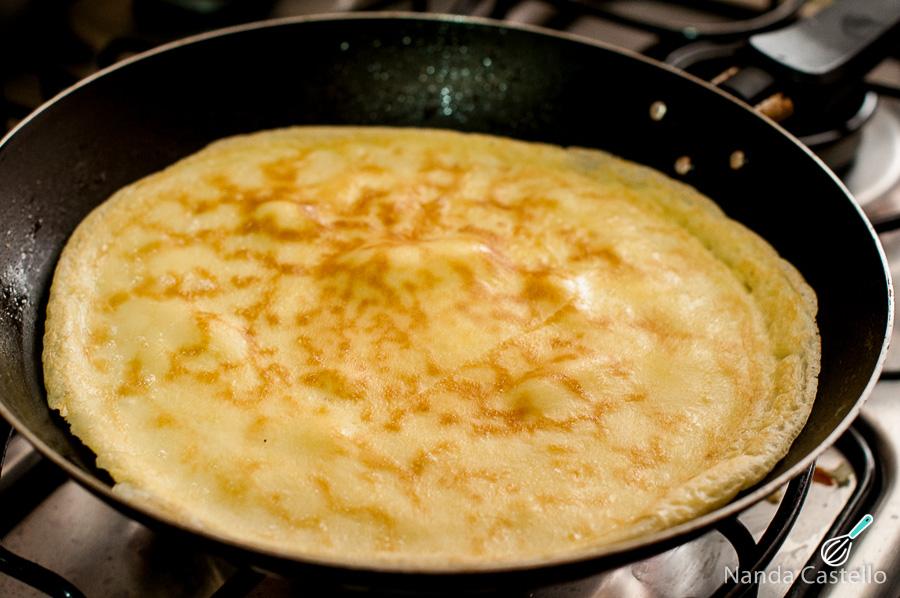 Aqueça uma frigideira antiaderente (ou unte com o óleo de coco) e adicione a mistura do passo anterior. Quando as bordas da crepioca de polvilho firmarem, use uma espátula para virá-la e cozinhar do outro lado.