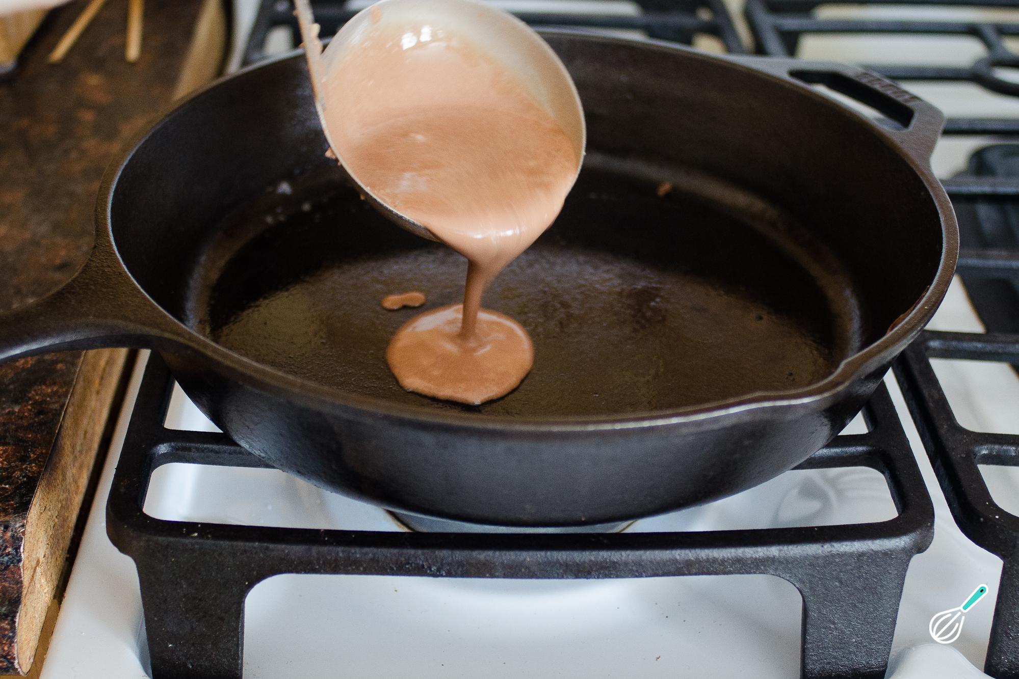 Unte uma frigideira antiaderente com um pouco de óleo de coco e adicione a massa. Distribua os quadradinhos de chocolate picadinhos, escondendo-os na massa, e leve a fogo médio até tomar consistência. Vire a crepioca de chocolate para cozinhar do outro lado.