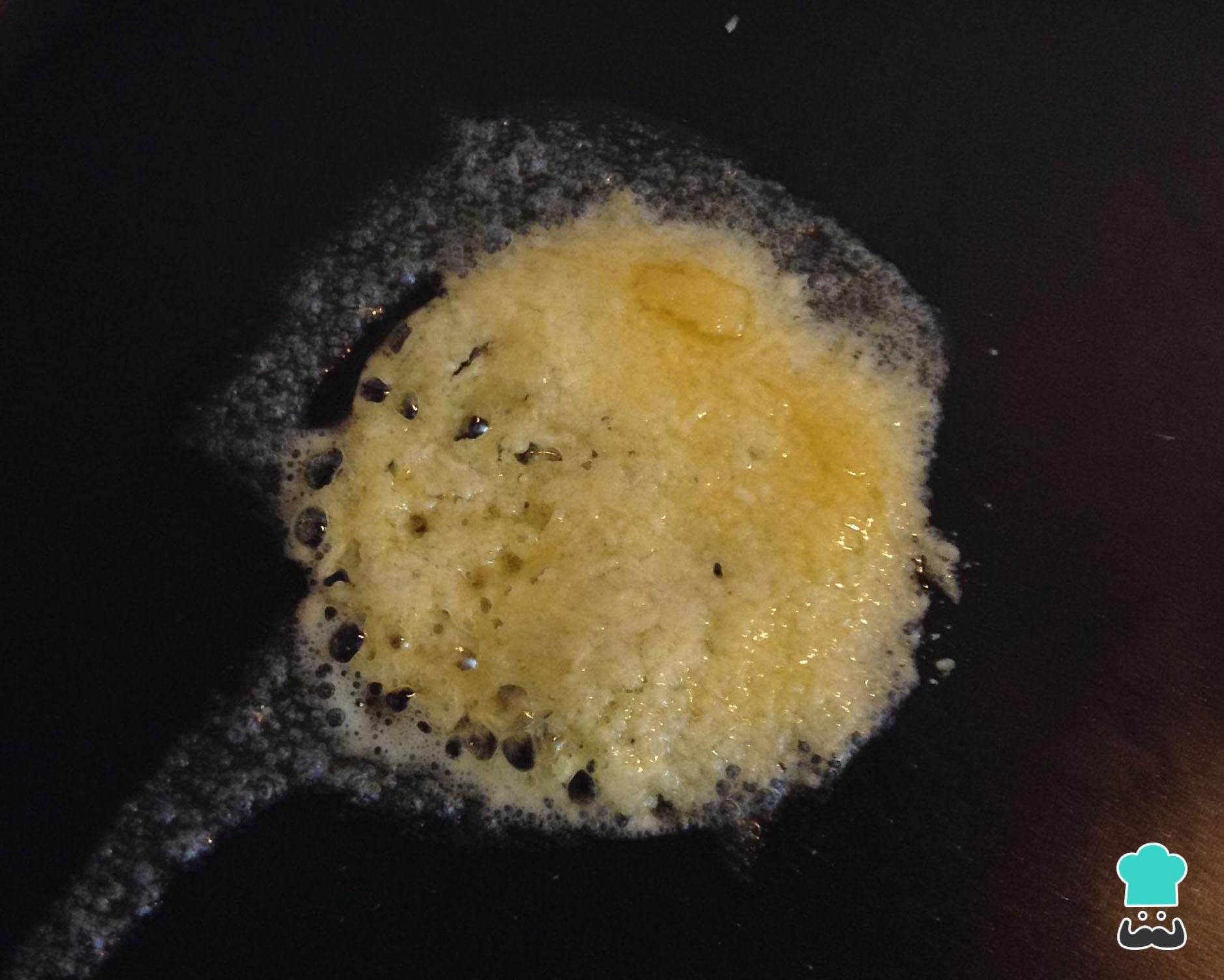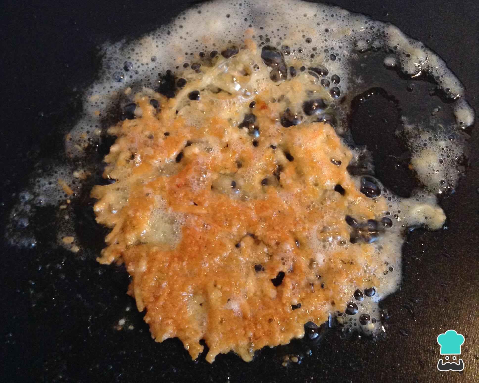 Leve ao fogo baixo uma frigideira antiaderente, com ou sem a manteiga, e deixe esquentar. Depois polvilhe um pouco de queijo parmesão de modo a conseguir uma camada uniforme em forma de disco e deixe derreter.