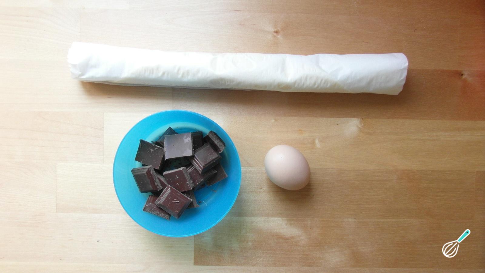 Para preparar o croissant de chocolate com massa folhada comece por reunir os ingredientes necessários.