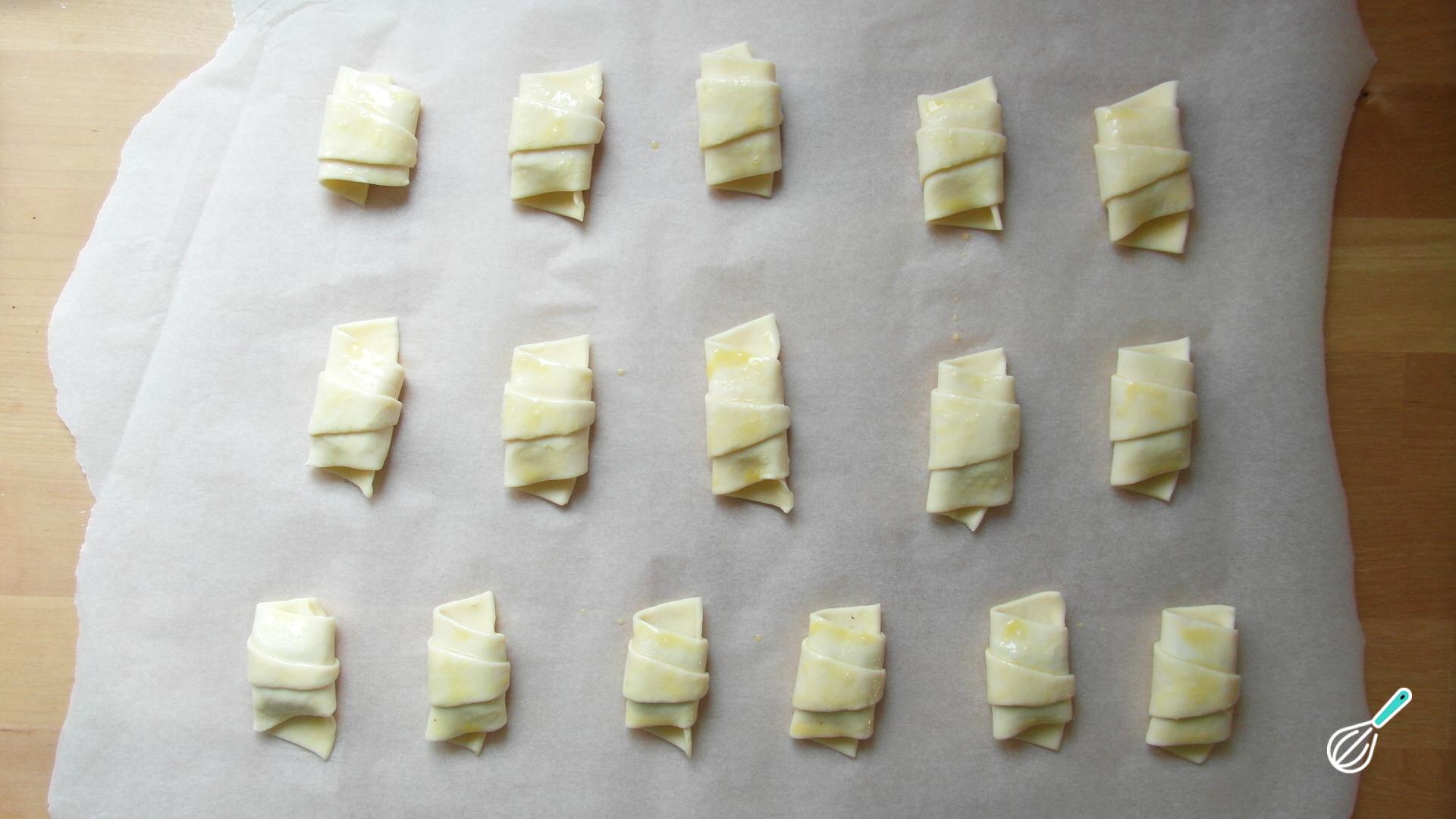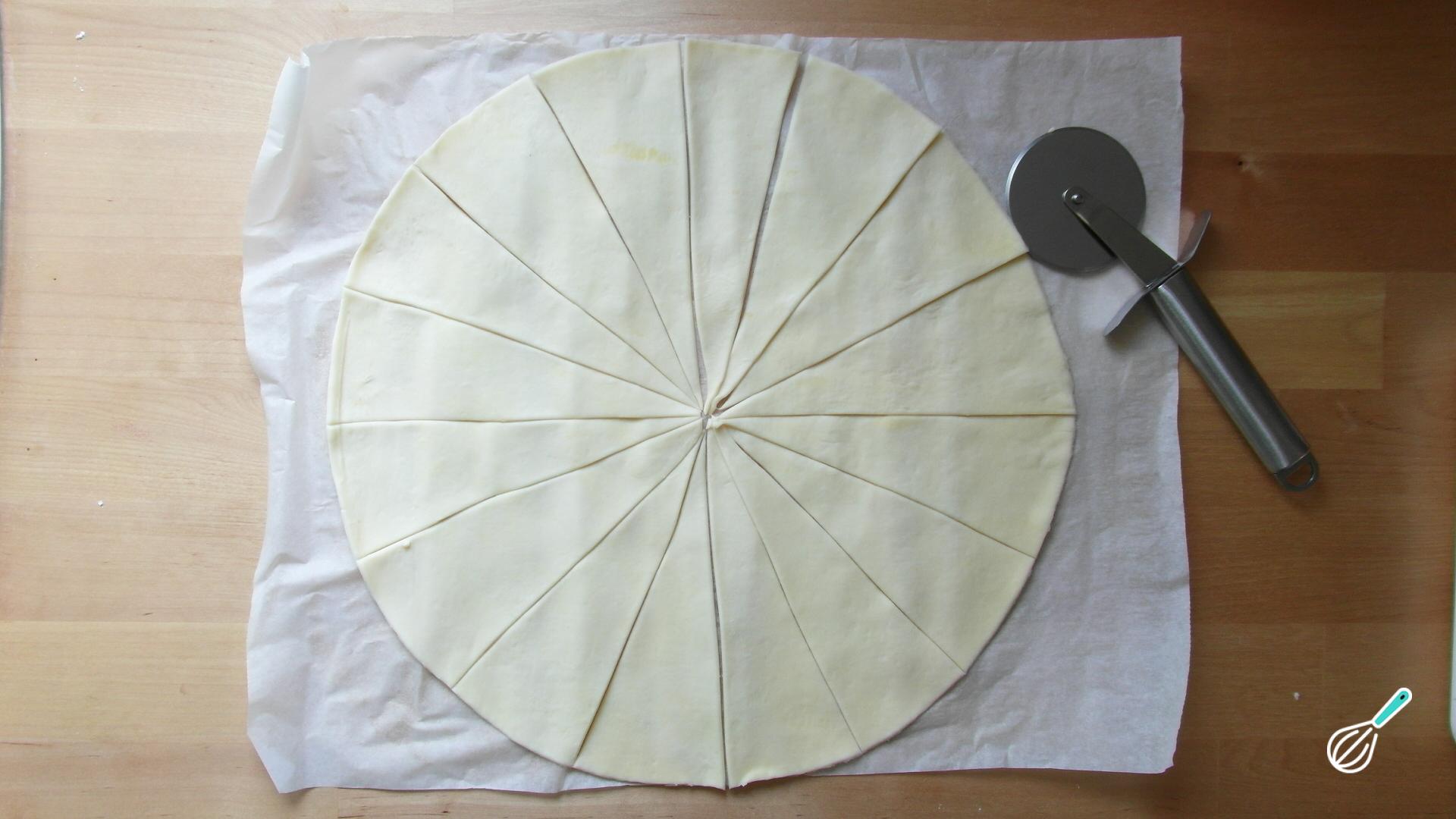 Abra a massa folhada e, usando uma faca ou cortador, corte em triângulos, tal como na fotografia.