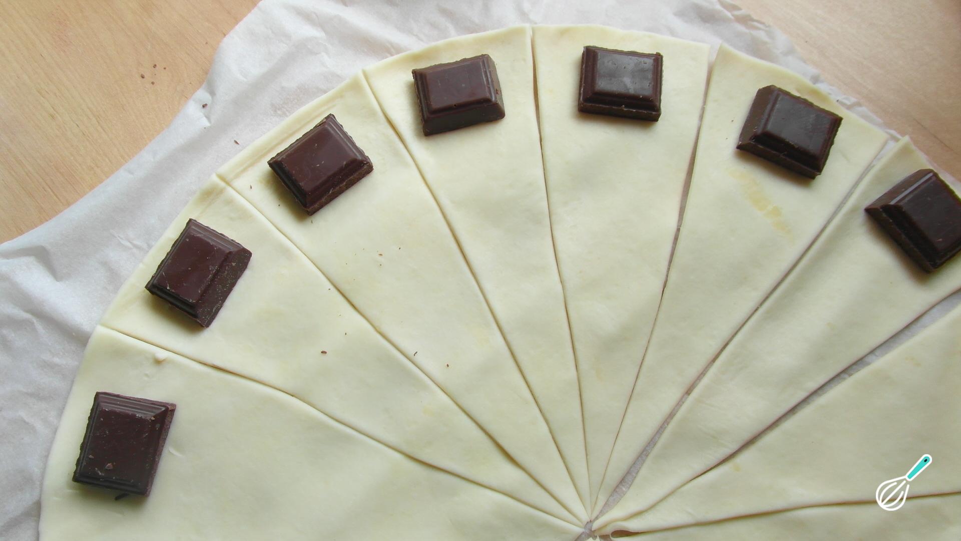 Na parte mais larga de cada fatia disponha um quadrinho de chocolate. Para estes croissants de massa folhada usei chocolate de leite, porém você pode usar também chocolate branco e assim preparar croissants de chocolate branco.