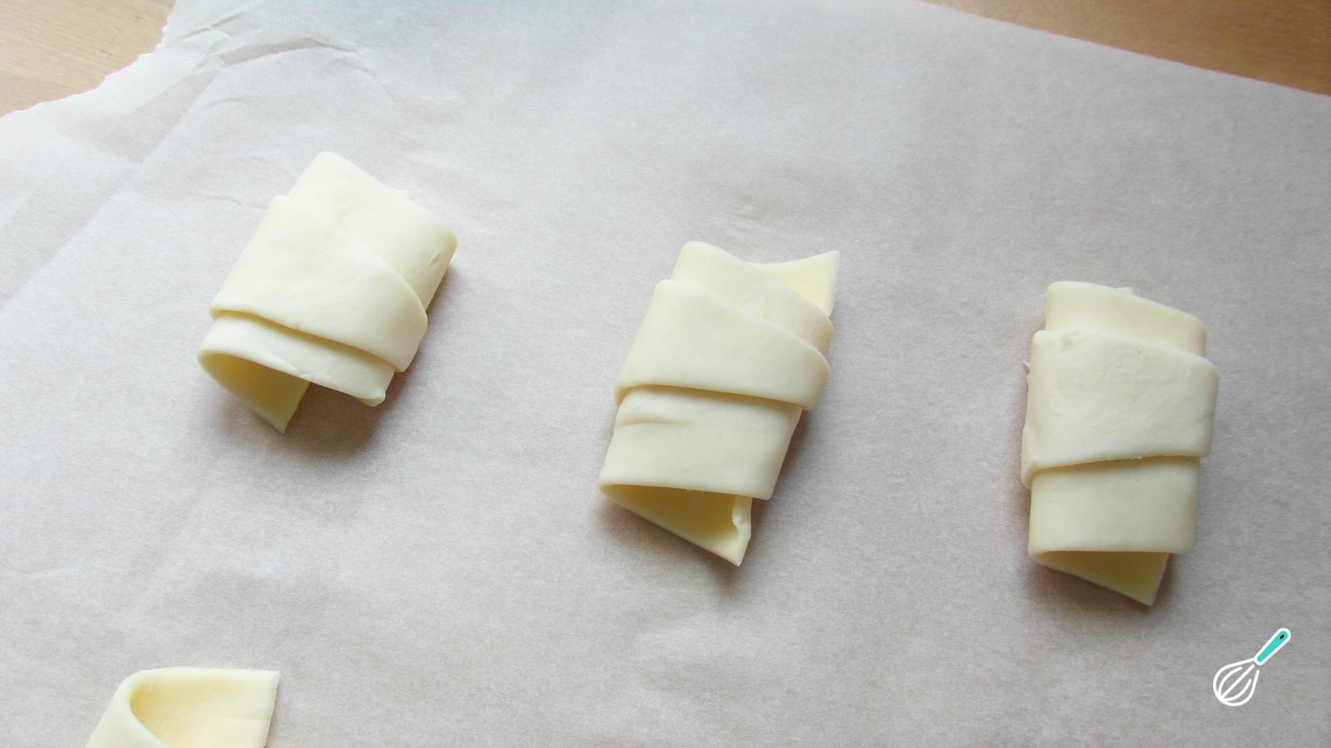 Dica: Não se preocupe com o fato dos croissants ficarem abertos de lado pois, no forno, à medida que a massa assa, eles irão fechar.