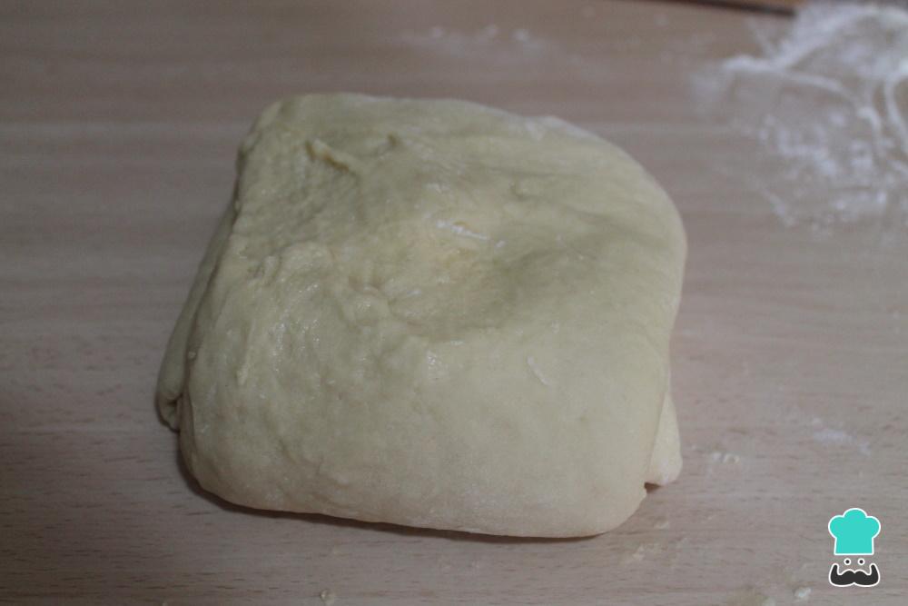 Em seguida polvilhe farinha numa bancada de trabalho e coloque nela a massa de croissant. Amasse e sove por 10 minutos ou até ficar macia e desgrudar das mãos.