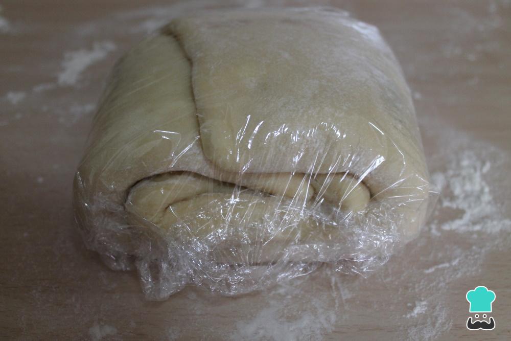 Por fim, dobre a outra metade também, de forma a conseguir um quadrado de massa. Embrulhe em plástico filme e reserve no congelador por 45 minutos.