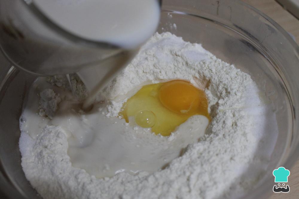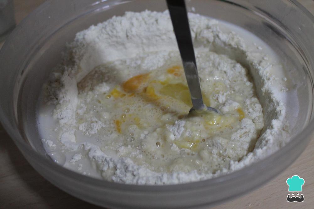 Comece misturando tudo com uma colher, do centro para fora, de modo a incorporar pouco a pouco os ingredientes na farinha.