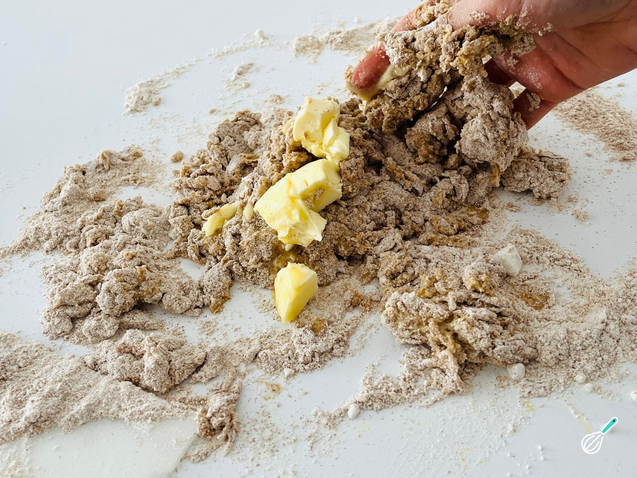 Acrescente a manteiga em ponto de pomada e amasse até obter uma massa homogênea. Não adicione farinha, mesmo que esteja pegajosa, para que os croissants fiquem macios e úmidos.