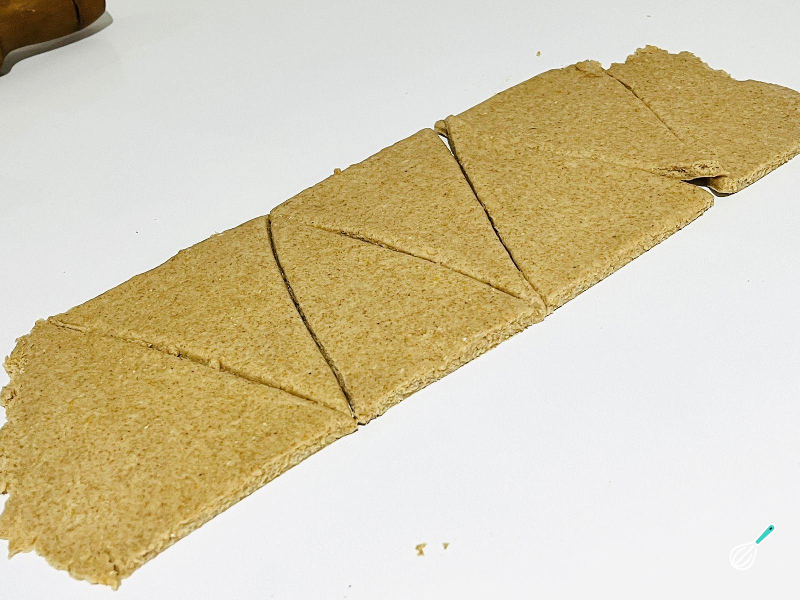 Quando a massa tiver crescido, estenda-a em um formato retangular com um pouco menos de 1 centímetro de altura. Faça cortes triangulares com uma base de cerca de 10 centímetros. Junte as bordas excedentes para esticar novamente e repita.