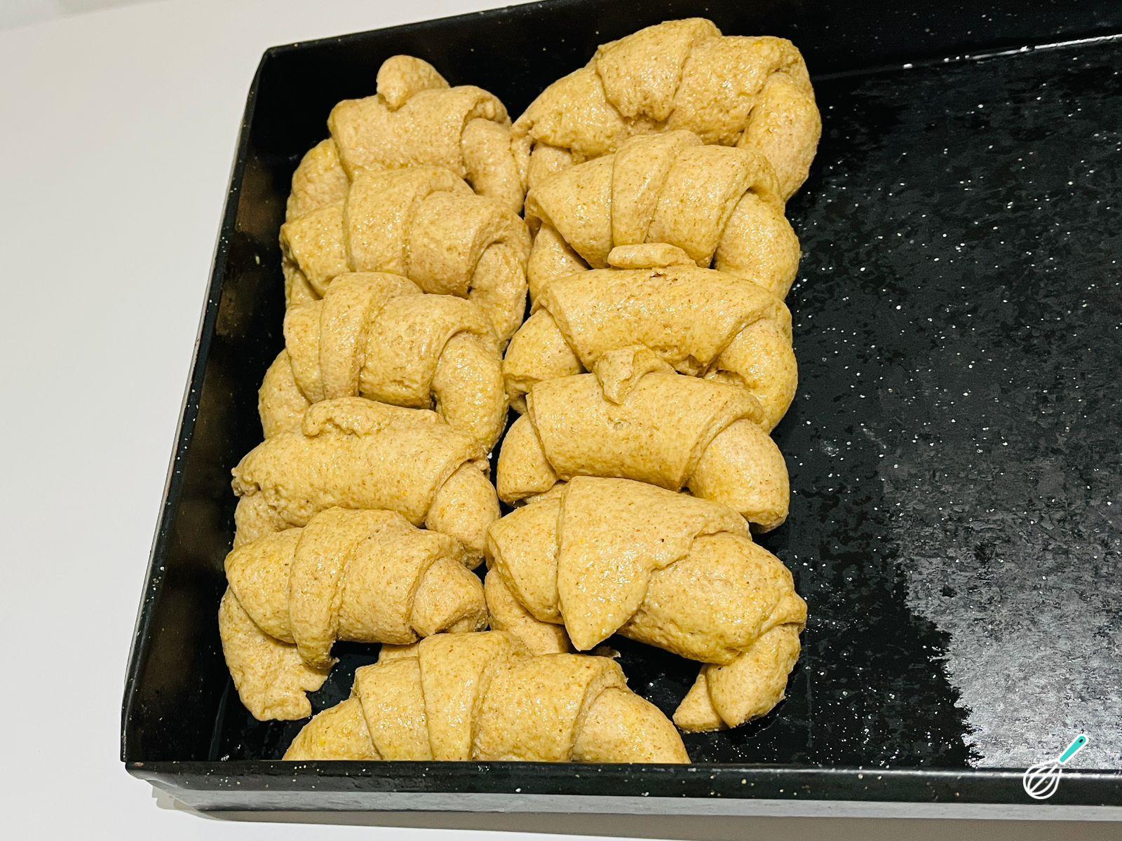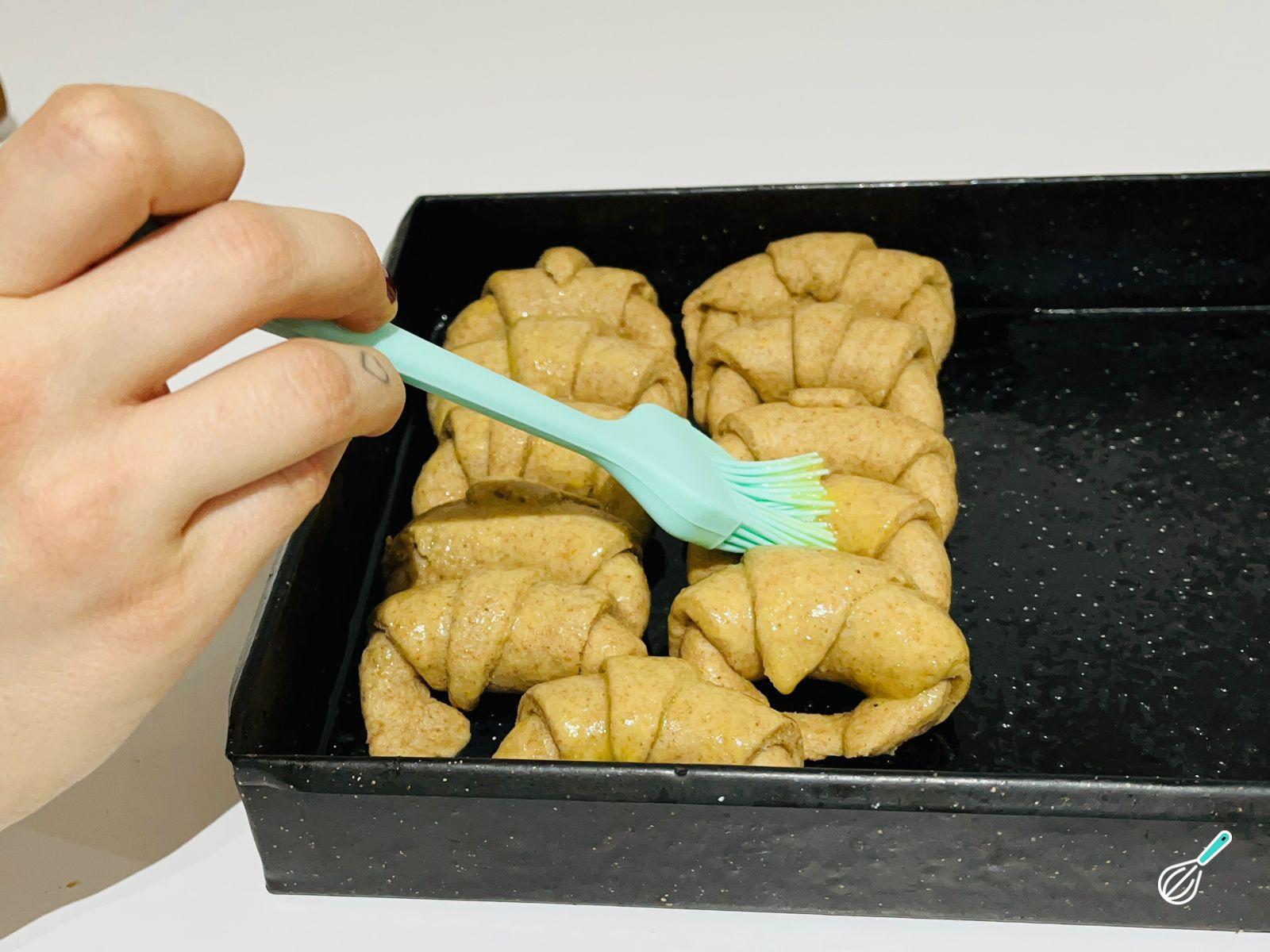 Disponha os croissants integrais em uma assadeira untada, com as extremidades dos croissants sobrepostas ao corpo do próximo croissant. Se desejar, você pode pincelá-los com ovo batido. Cubra e deixe crescer novamente por cerca de 20 minutos. Enquanto isso, aqueça o forno a 180 ºC.