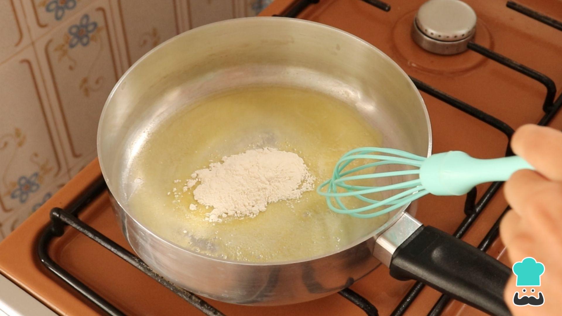 Leve uma panela ao fogo baixo e coloque a manteiga. Assim que derreter, adicione a farinha e misture bem.
