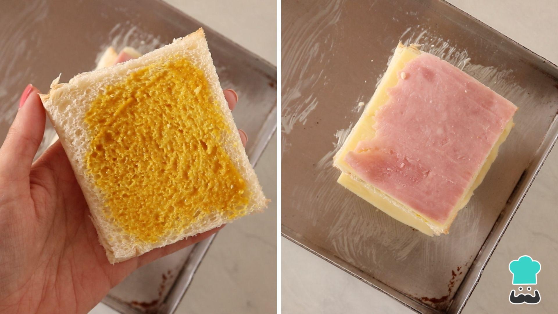 Unte uma assadeira com um pouco de manteiga. E monte o lanche: passe mostarda em uma fatia de pão. Coloque na assadeira e adicione uma fatia de queijo e uma fatia de presunto. Mais uma fatia de pão com mostarda. Queijo e presunto e uma fatia de pão.